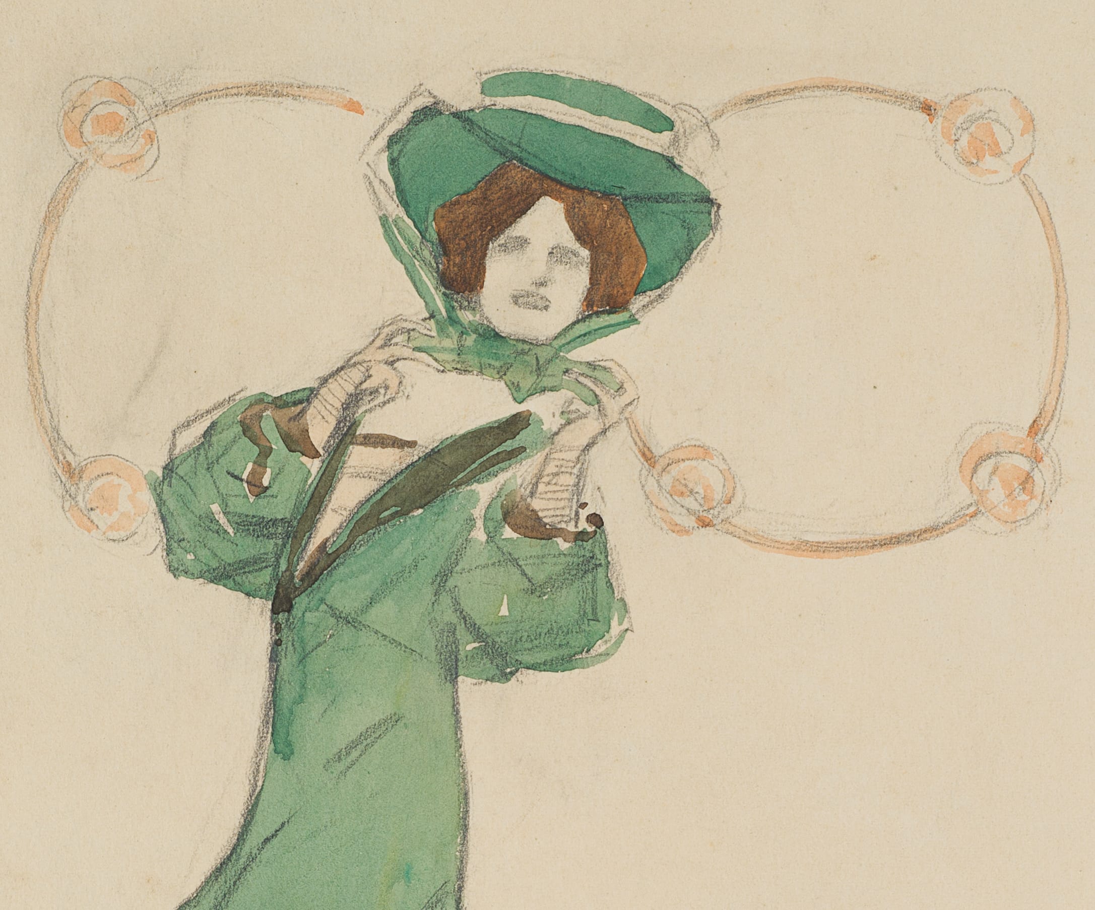 - Beschreibung: Darstellung einer Dame mit grünem Kleid und Hut, umgeben von ornamentalen Verzierungen.