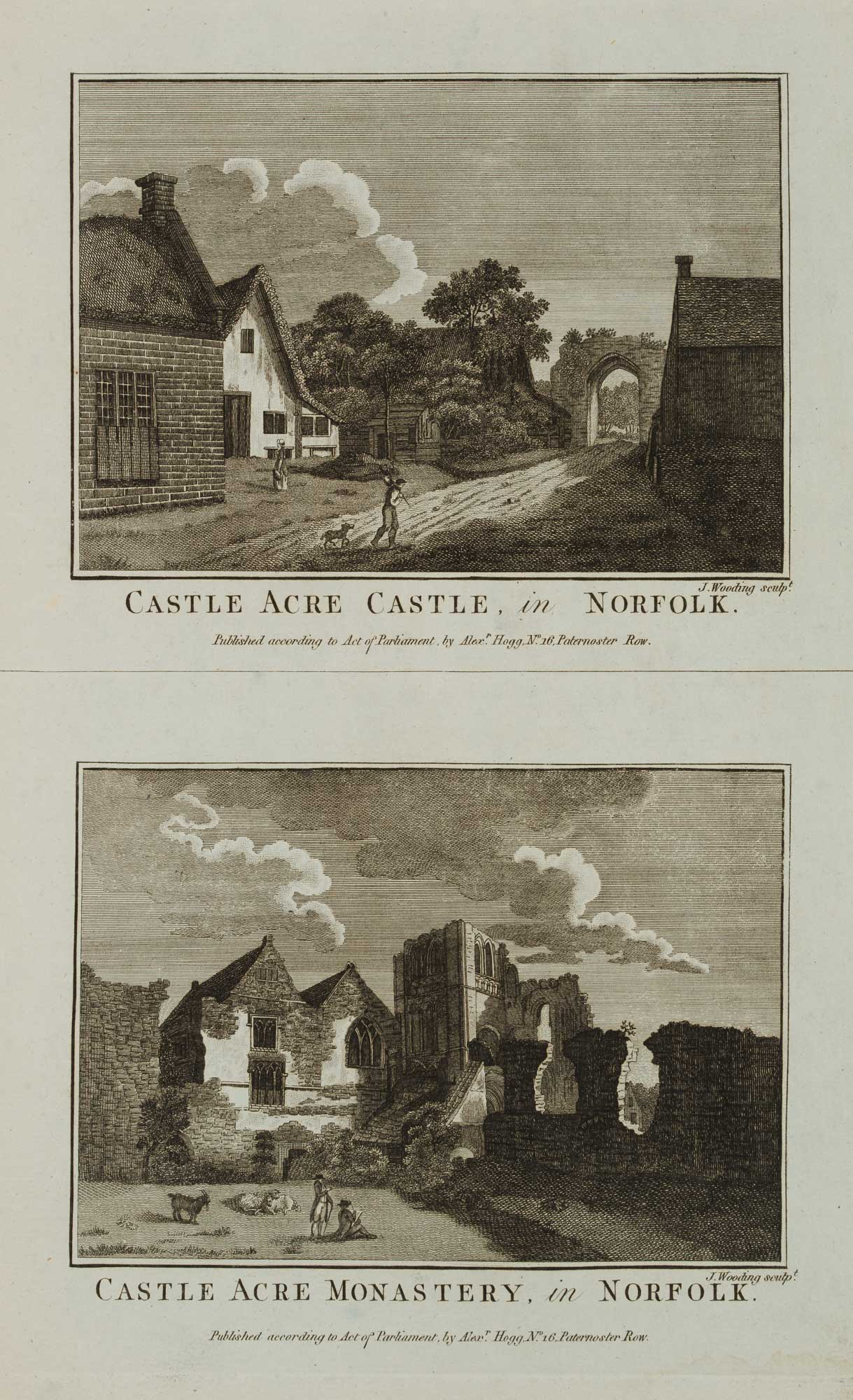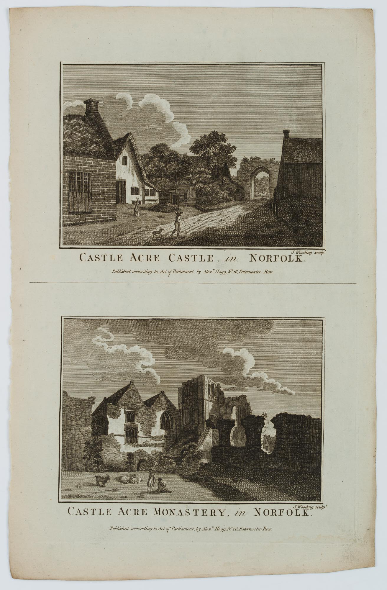 J. Wooding (1788 – 1790 ), Two architectural and landscape depictions, “Castle Acre Castle, Norfolk”, “Castle Acre Monastery, Norfolk”, 18th century, Etching