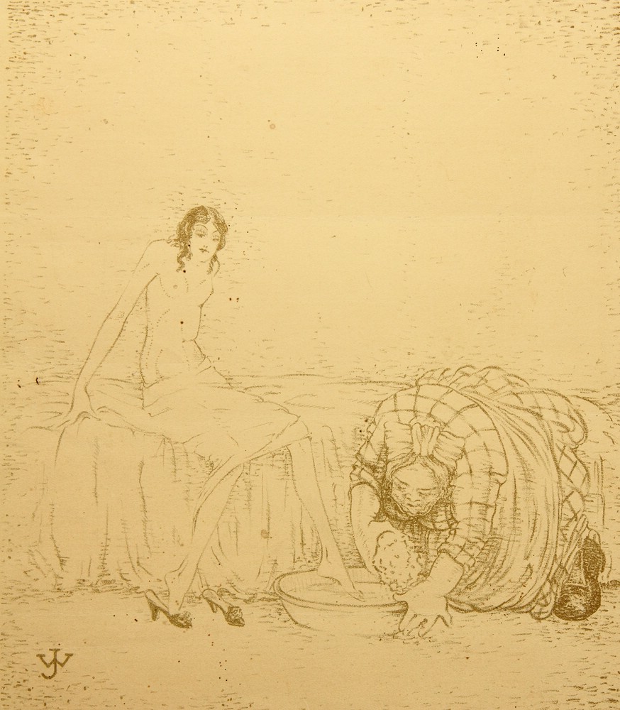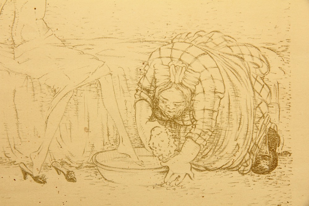 Johann Würstl (*1888 München), Griesgrämige Magd wäscht Dame die Füße, , Lithographie
