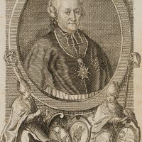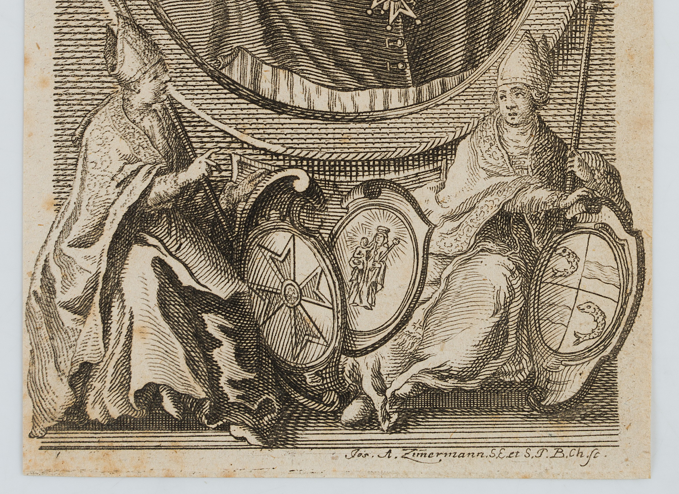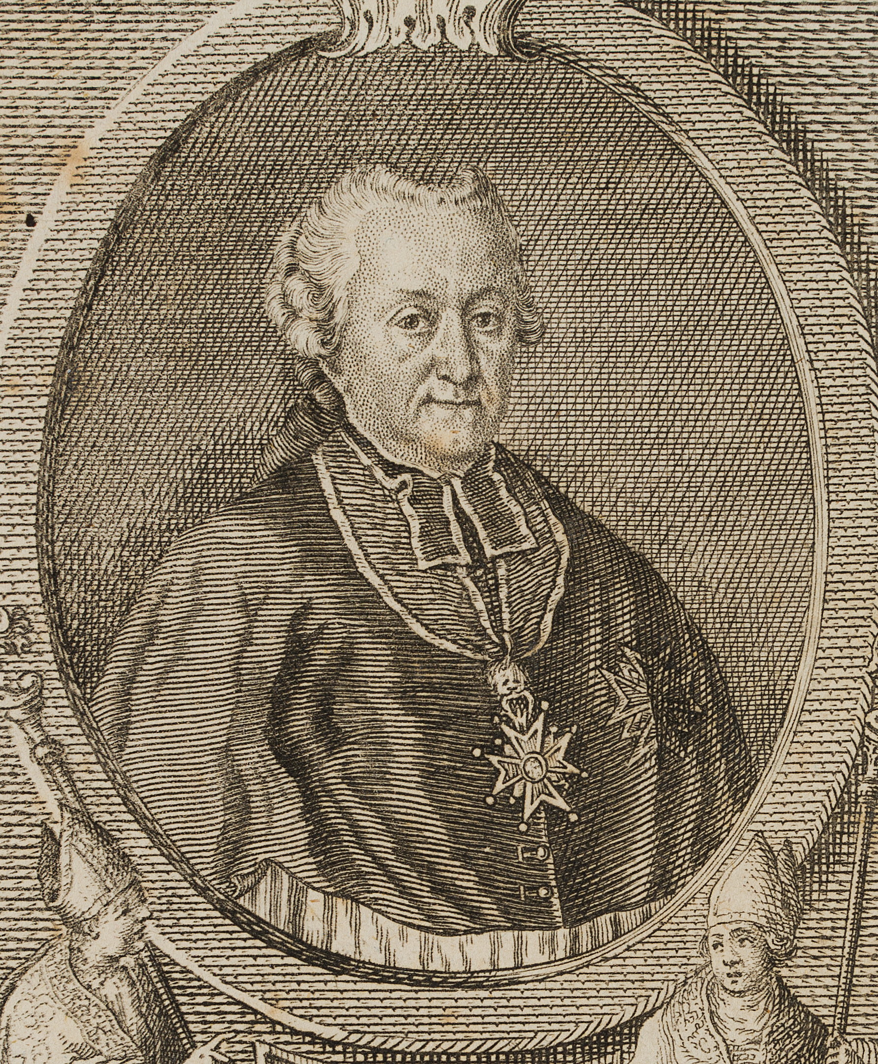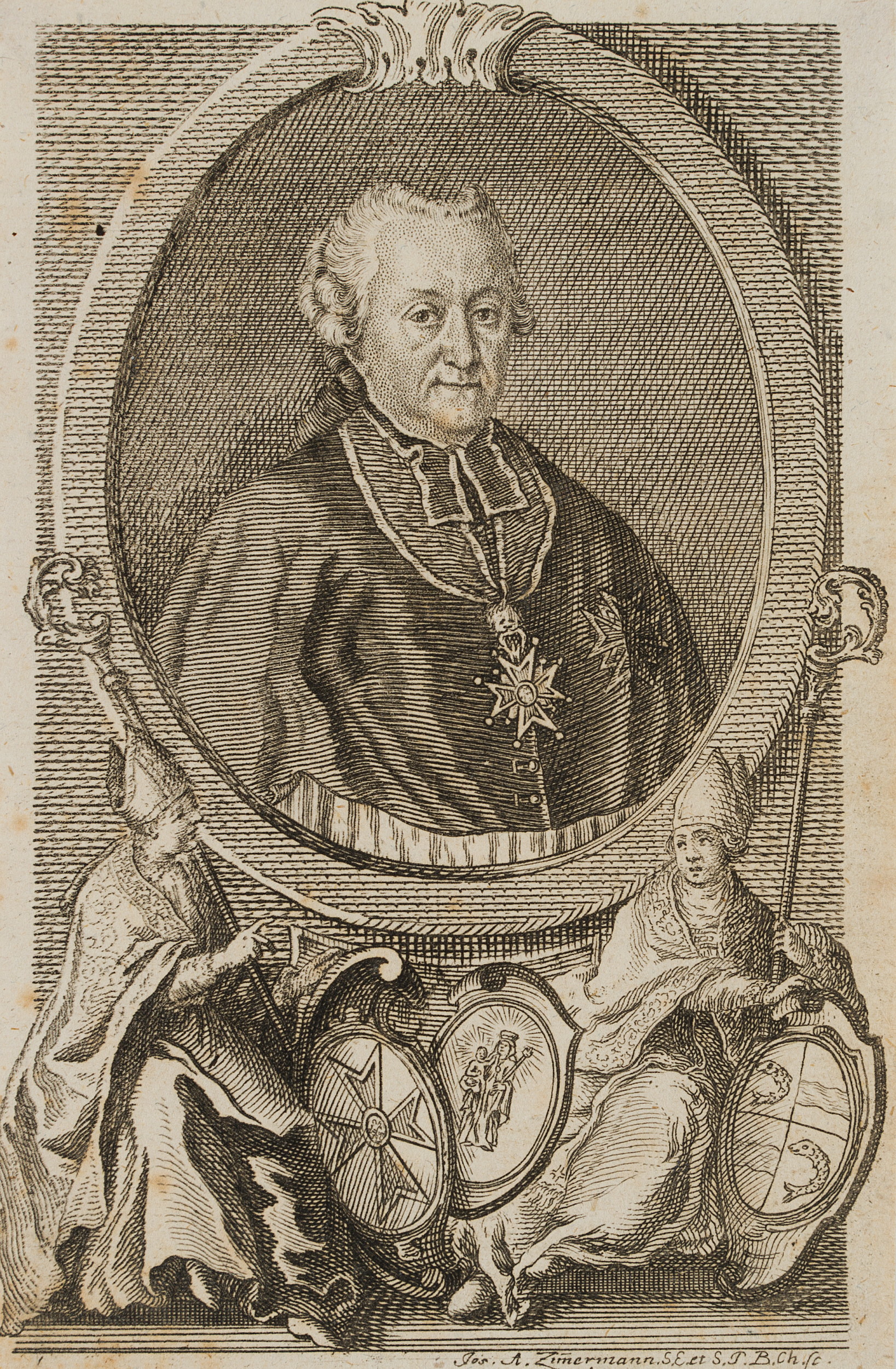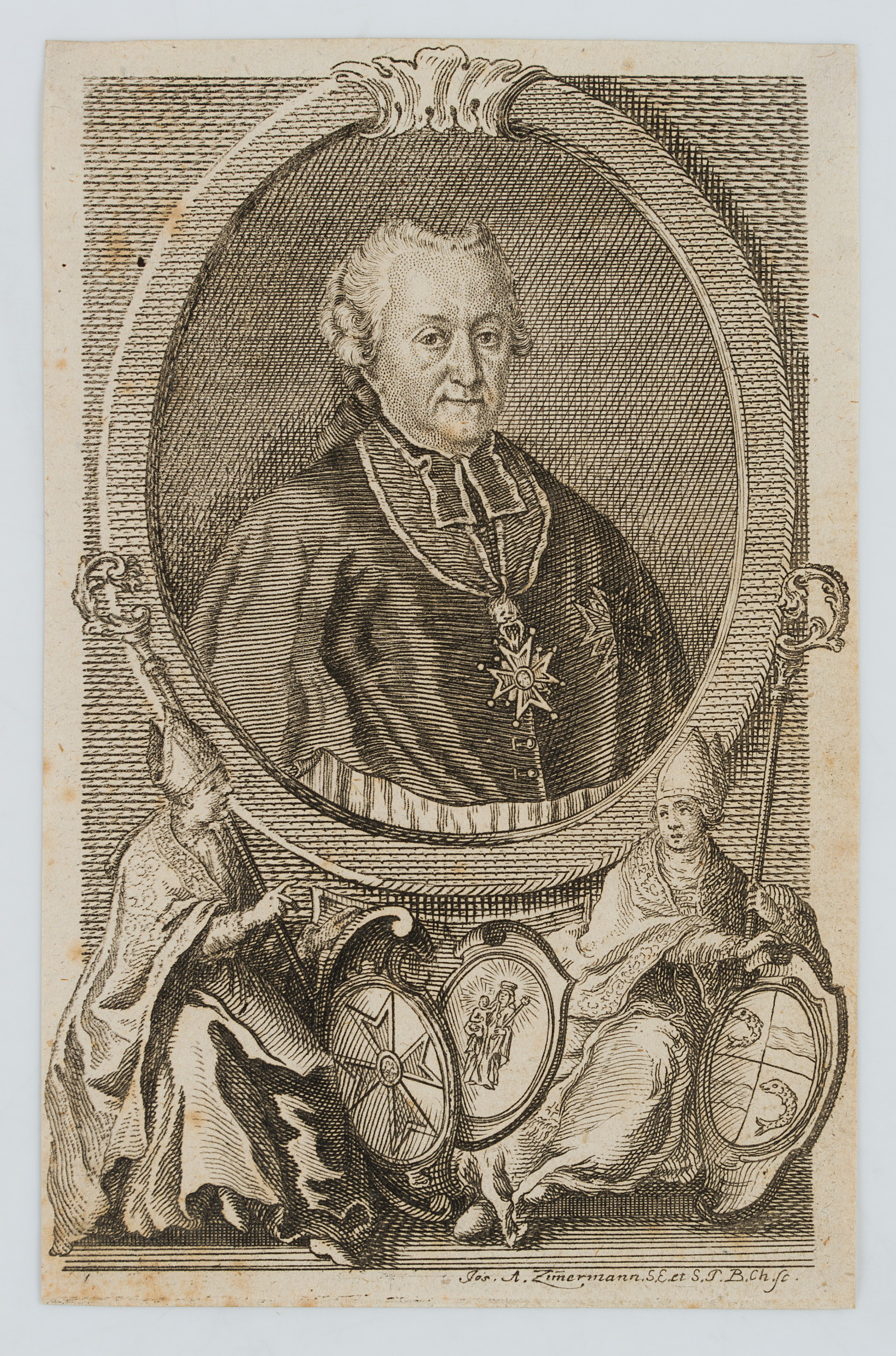 - Beschreibung: Brustbild eines Würdenträgers mit Orden in Form eines Malteserkreuzes sowie Bruststern. Als Rahmenfiguren zwei Geistliche in Bischofsornat mit Wappen.