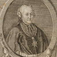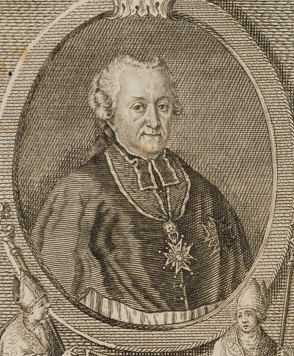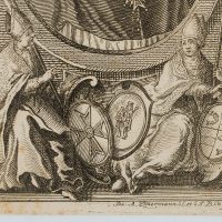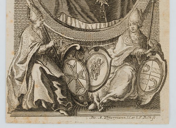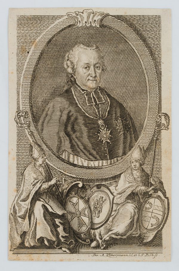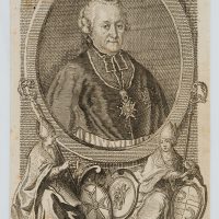 - Description: Half-length portrait of a dignitary with order in the form of a Maltese cross and breast star. Two clergymen in bishop’s regalia with coat of arms as frame figures.