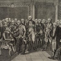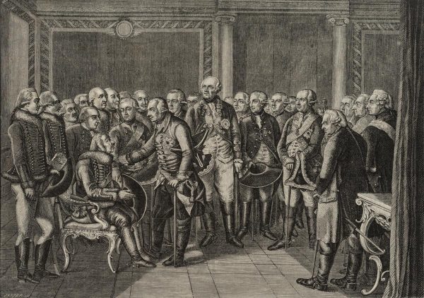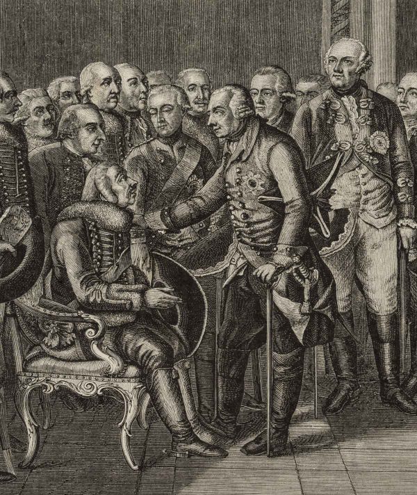 - Description: In the Parole Hall at the Royal Palace in Berlin, the old Hussar General Hans Joachim von Zieten sits on the left and looks at King Frederick II standing in front of him, who puts his hand on Ziethen’s shoulder and asks him, who is about to stand up, to remain seated. Around the group stand the royal princes, generals and other military soldiers.