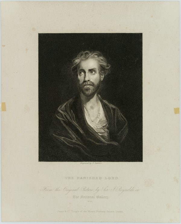 - Description: inscribed “Engraved by J. Jenkins”, titled below “The Banished Lord. From the Original Picture by Sir J. Reynolds in the National Gallery, No. 28”. The steel engraving shows a portrait of the “Banished Lord”, after a painting by Sir Joshua Reynolds. Alongside William Hogarth and Thomas Gainsborough, Reynolds was the most famous and, through his artistic and theoretical work, the most influential English painter of the 18th century.