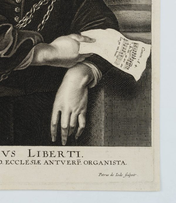 - Bezeichnung: Unterhalb der Darstellung mit dem Namen des Dargestellten beschriftet: “Henricus Liberti. Groeningensis Cathed. Ecclesiae Antwerp. Organista.”, darunter in der Druckplatte links und rechts signiert.