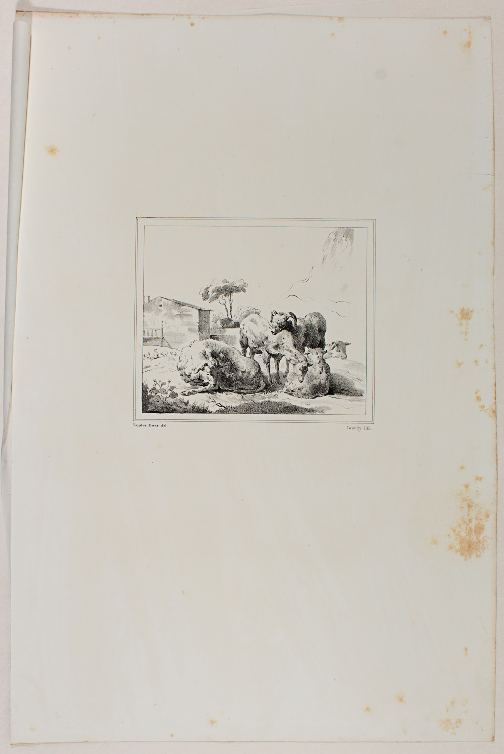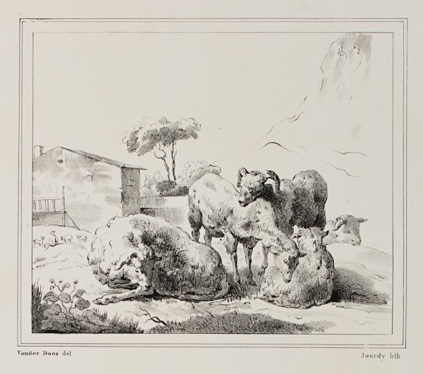 - Description: “Group of Sheep”. Lithograph after a work by Vander Does – also DOUX -(1623 1673). He was a painter of the Dutch School. Lithograph by Jourdy. From the series: Pictures of the Flemish, Dutch and German School (ECOLE FLAMANDE, HOLLANDAISE ET ALLEMANDE). Inscribed: Vander Does del. Jourdy lith.