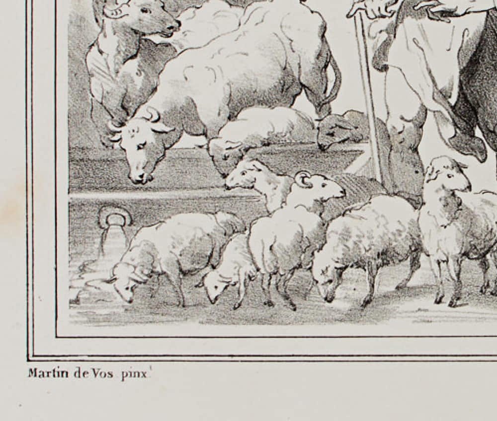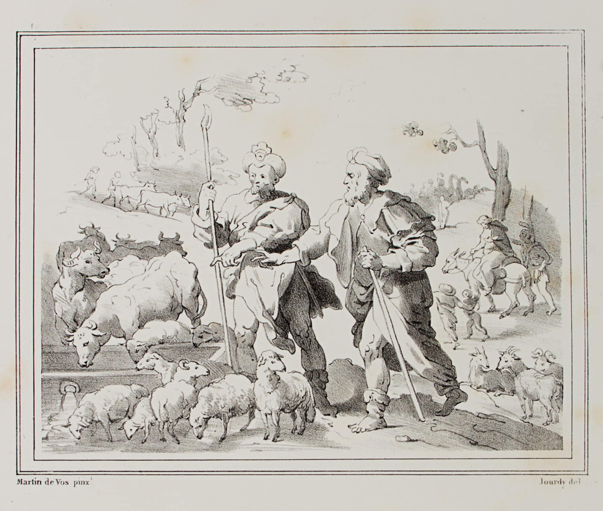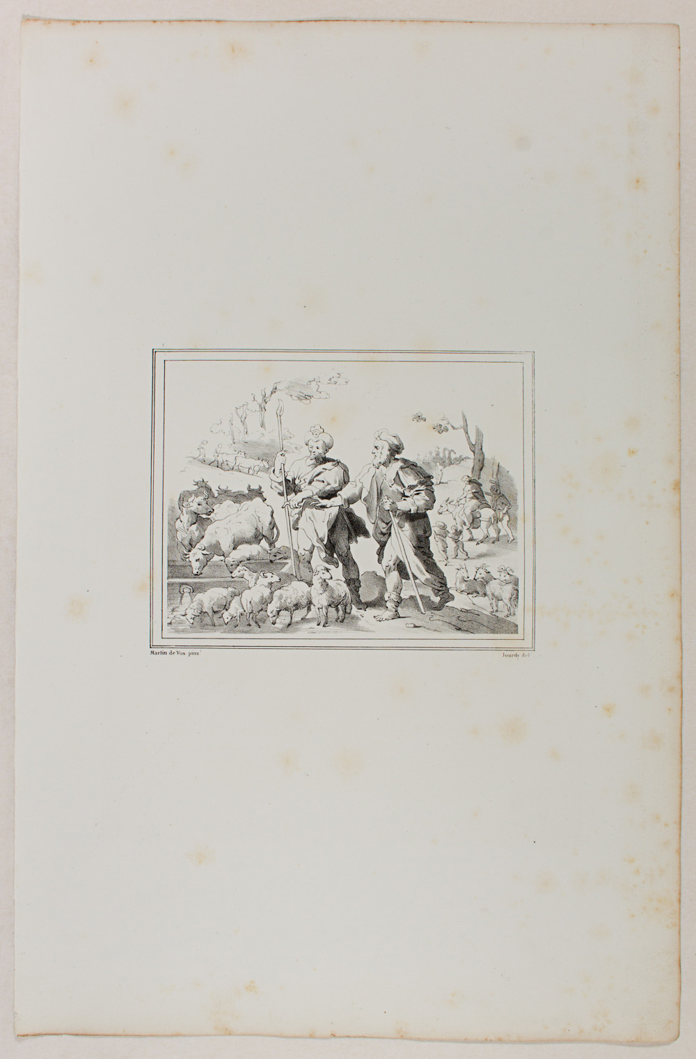 - Description: “Shepherds in the Field.” Lithograph after a work by Martin de Vos (1536 -1604). From the series: Pictures of the Flemish, Dutch and German School (ECOLE FLAMANDE, HOLLANDAISE ET ALLEMANDE). Inscribed: Martin de Vos pin/. Jourdy del.