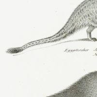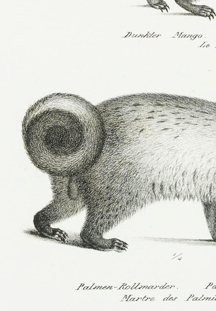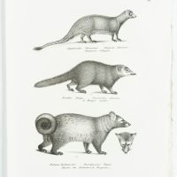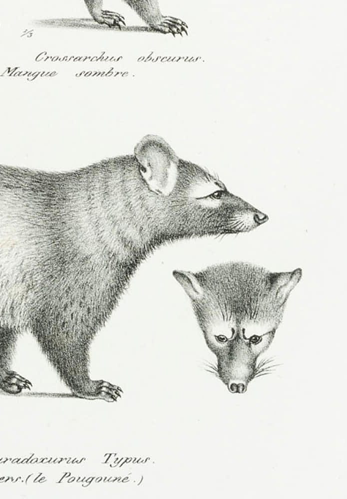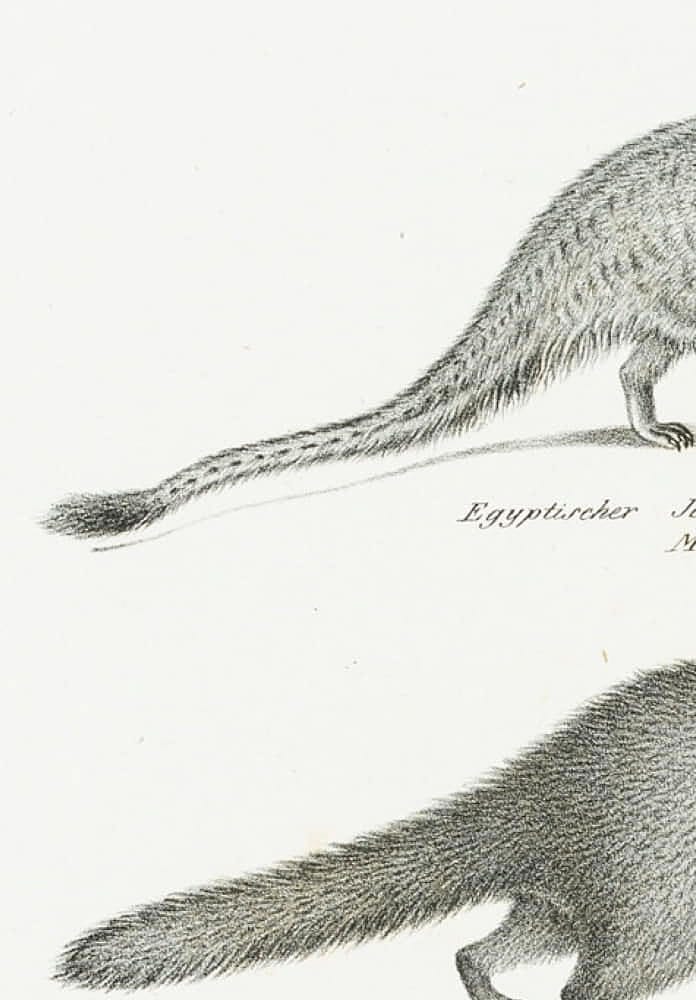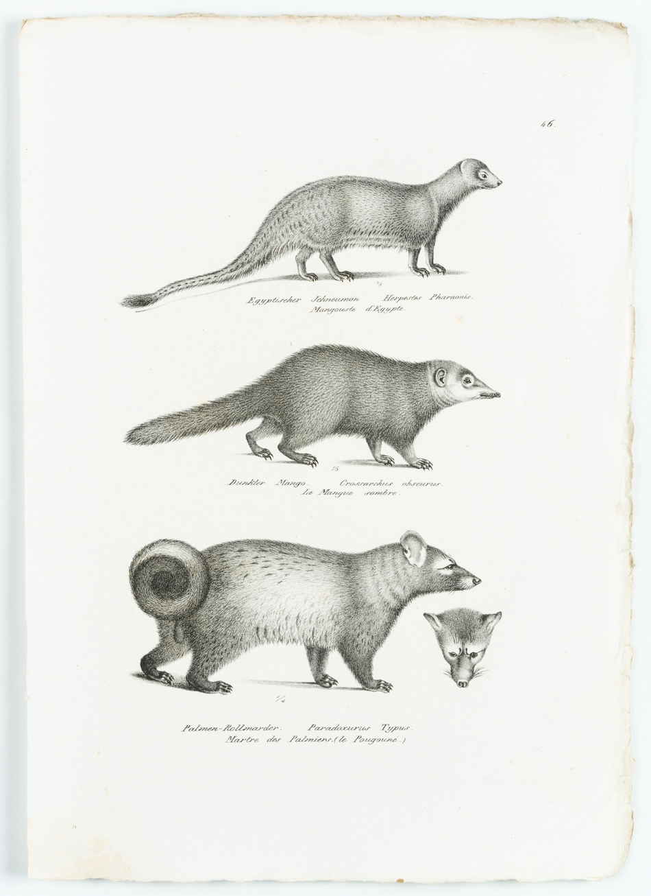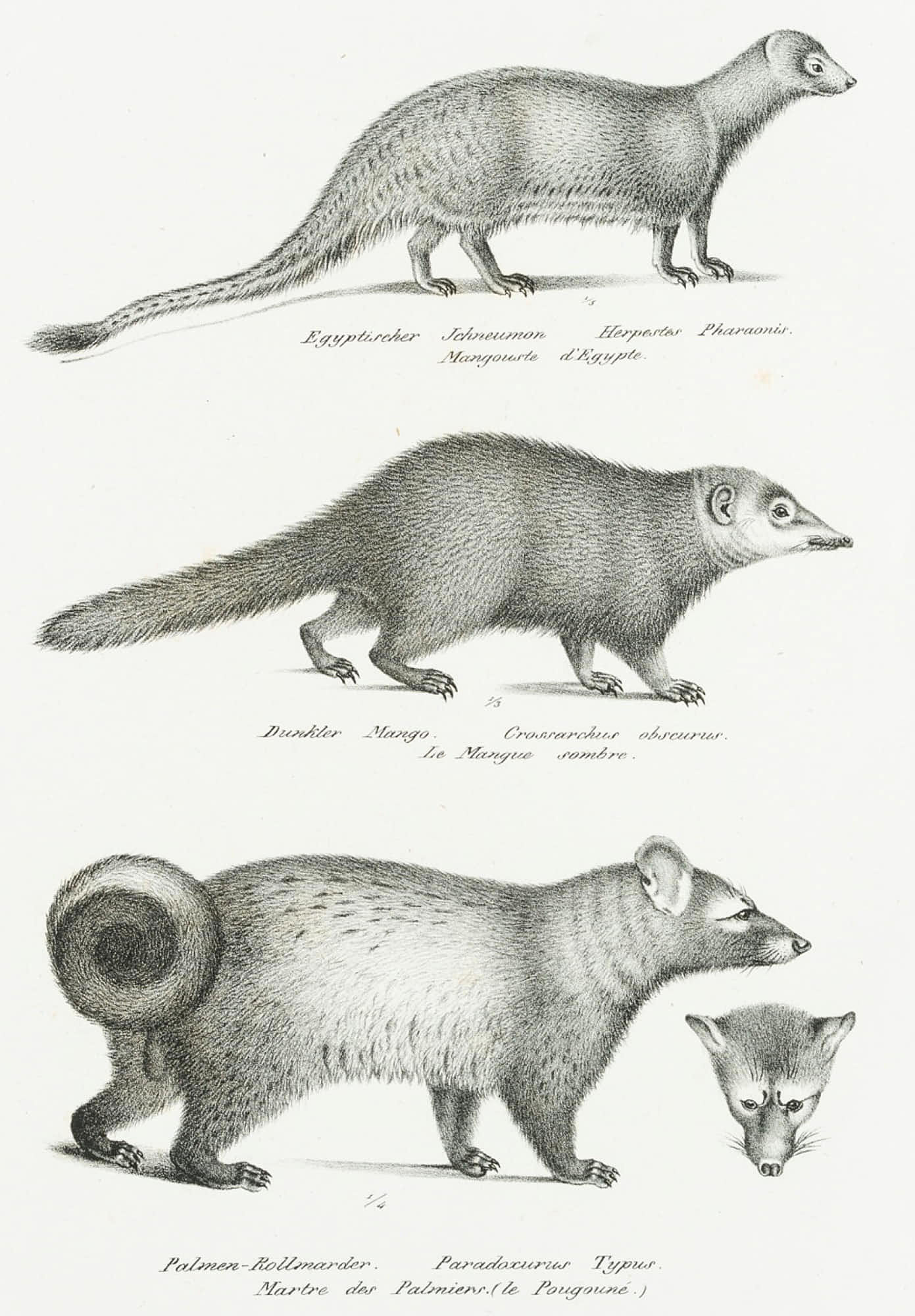 - Bezeichnung: Unten betitelt: “Egyptischer Ichneumon. Herpestes Pharaonis. Mangouste d’Egypte.” und “Dunkler Mango. Crossarchus obscurus.” und “Palmen-Rollmarder. Paradoxurus Typus. Martre des Palmiers. (le Pougouné.)”