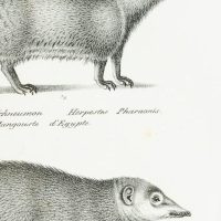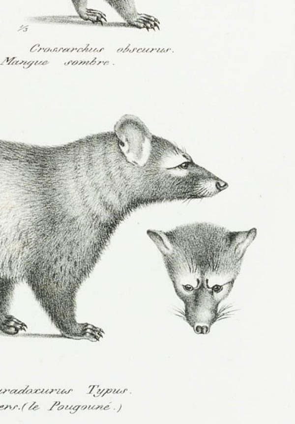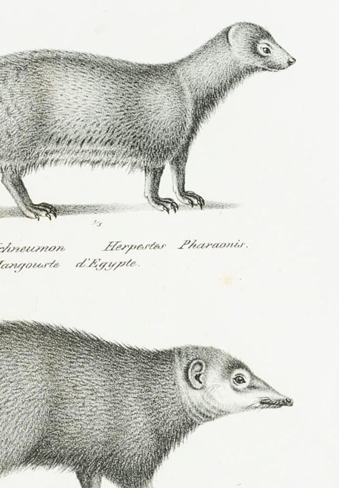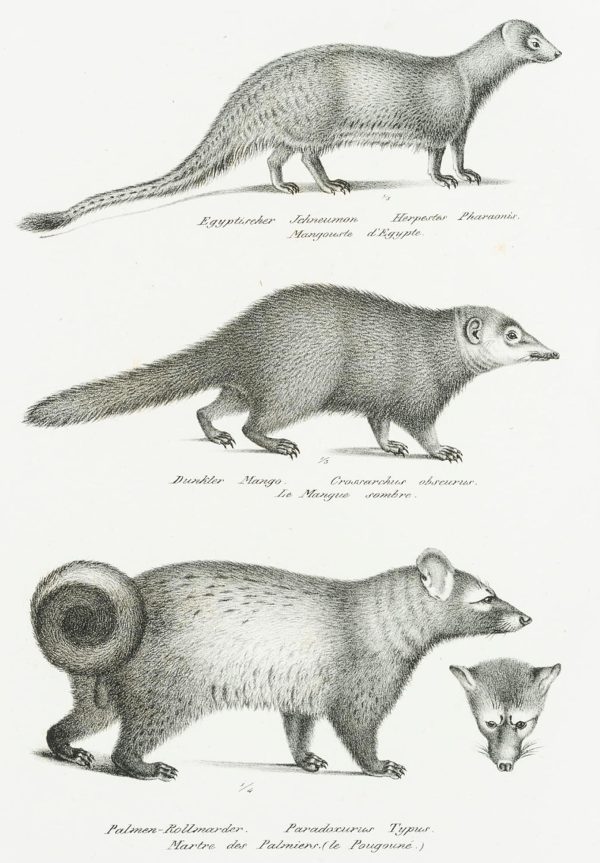 - Inscription: Titled below: “Egyptian Ichneumon. Herpestes Pharaonis. Mangouste d’Egypte.” and “Dark Mango. Crossarchus obscurus.” and “Palm-rolling marten. Paradoxurus typus. Martre des Palmiers. (le Pougouné.)”