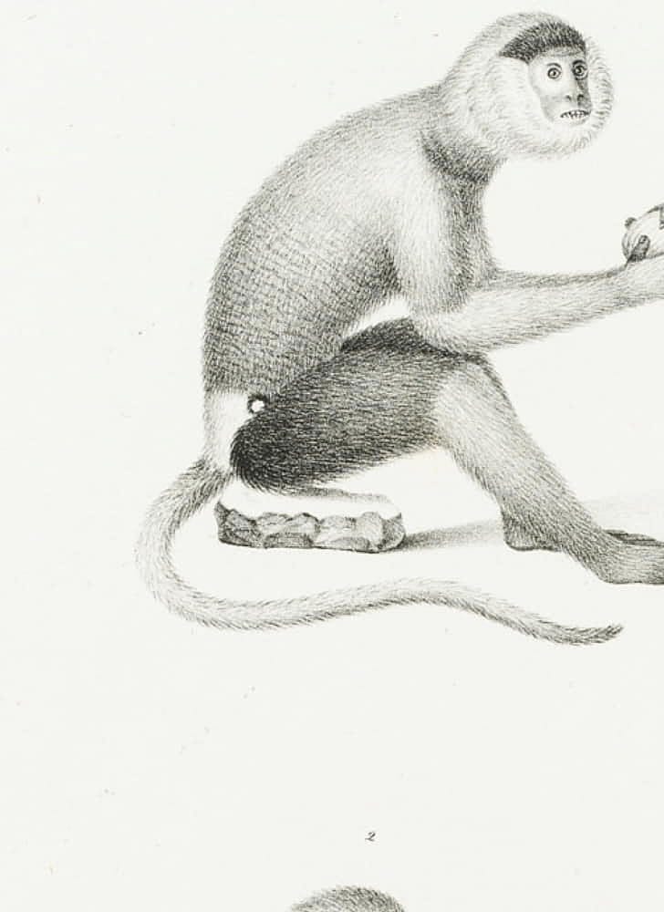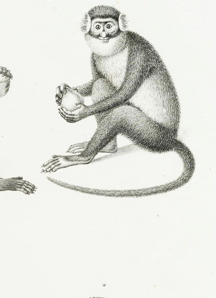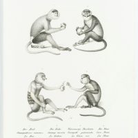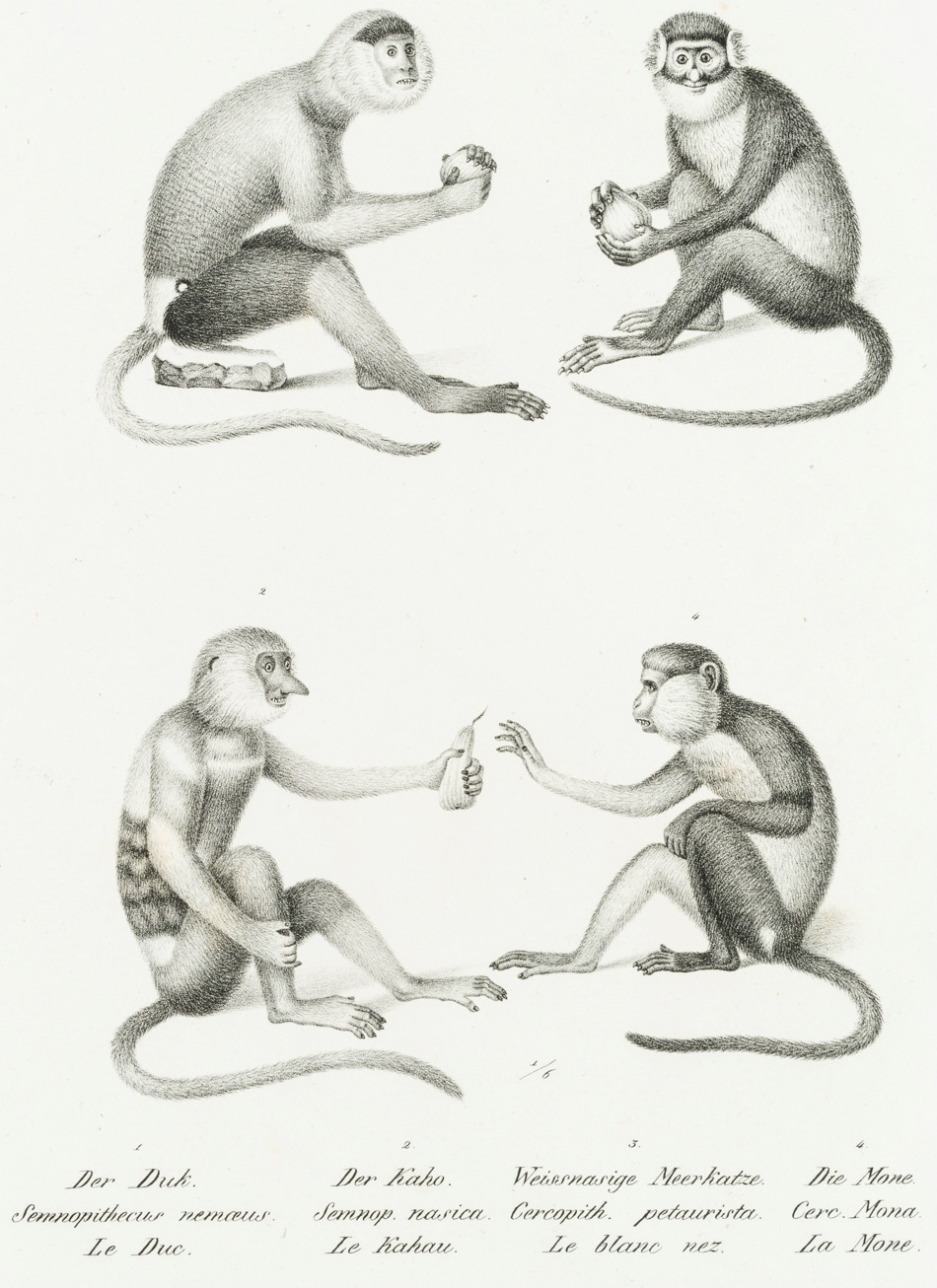 - Inscription: Titled below: “The Duk. Semnopithecus nemæus. Le Duc.” and “The Kaho. Semnop. Nasica. Le Kahau.” and “White-nosed guenon. Cercopith. Petaurista. Le blanc nez.” and “The Mone. Cerc. Mona. La Mone.”