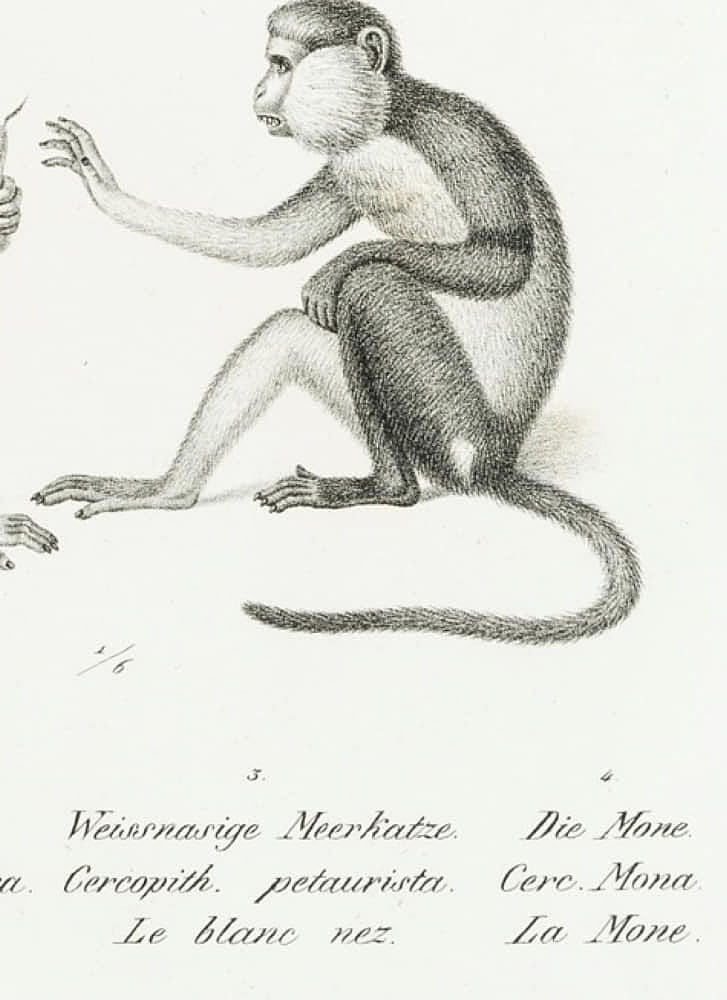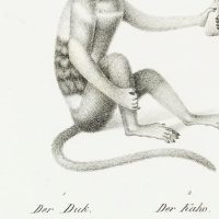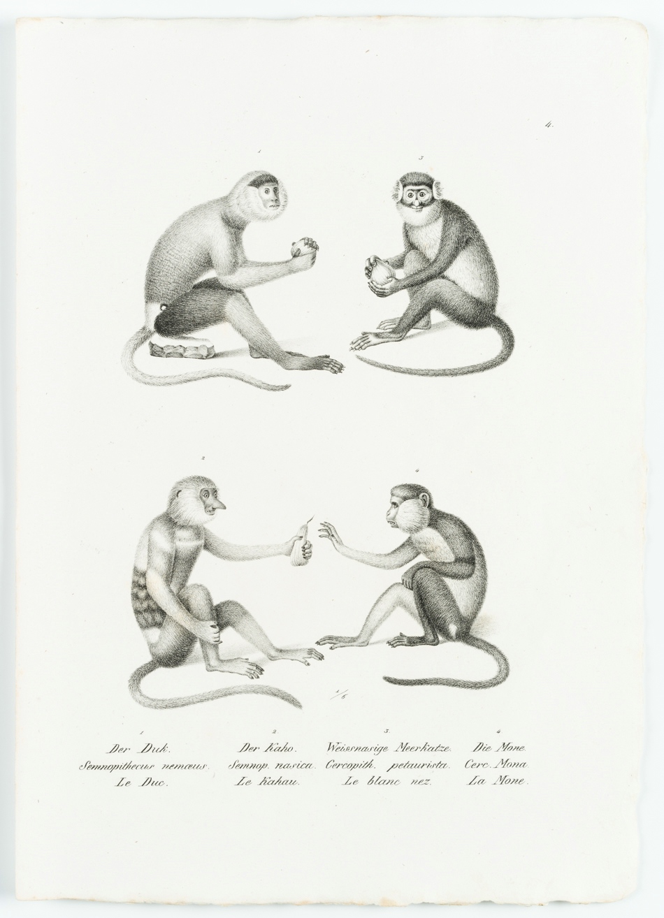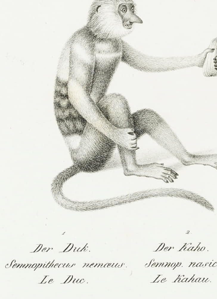 - Bezeichnung: Unten betitelt: “Der Duk. Semnopithecus nemæus. Le Duc.” und “Der Kaho. Semnop. Nasica. Le Kahau.” und “Weissnasige Meerkatze. Cercopith. Petaurista. Le blanc nez.” und “Die Mone. Cerc. Mona. La Mone.”