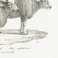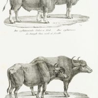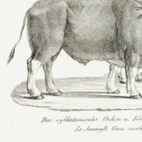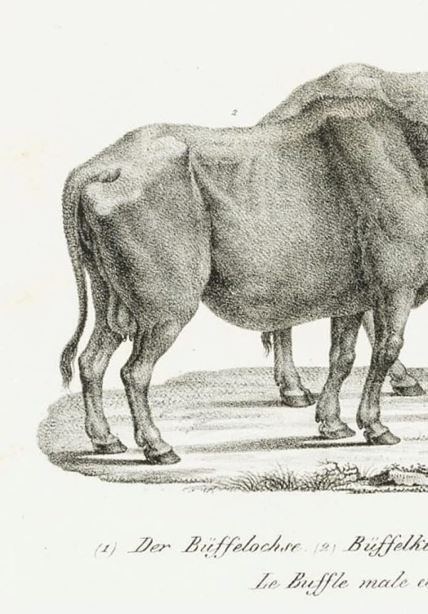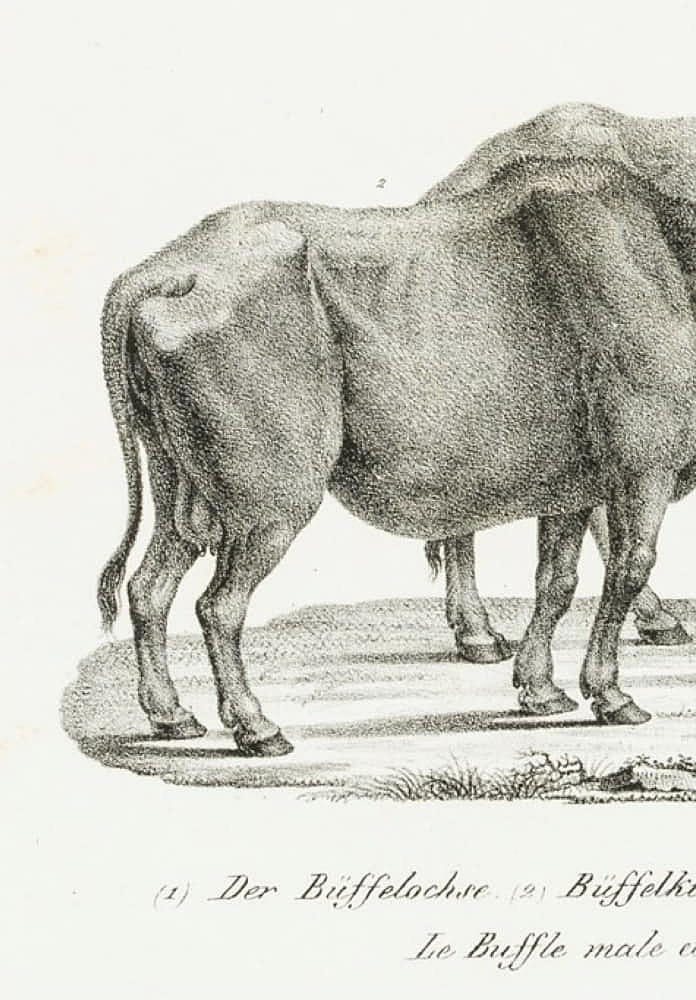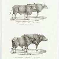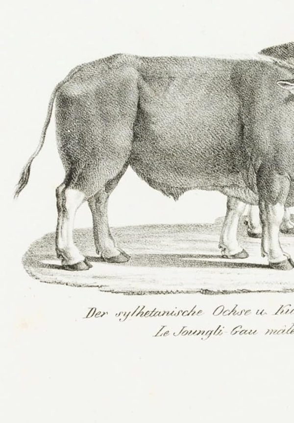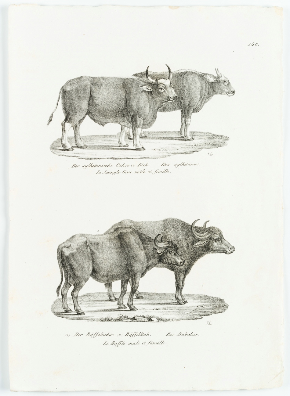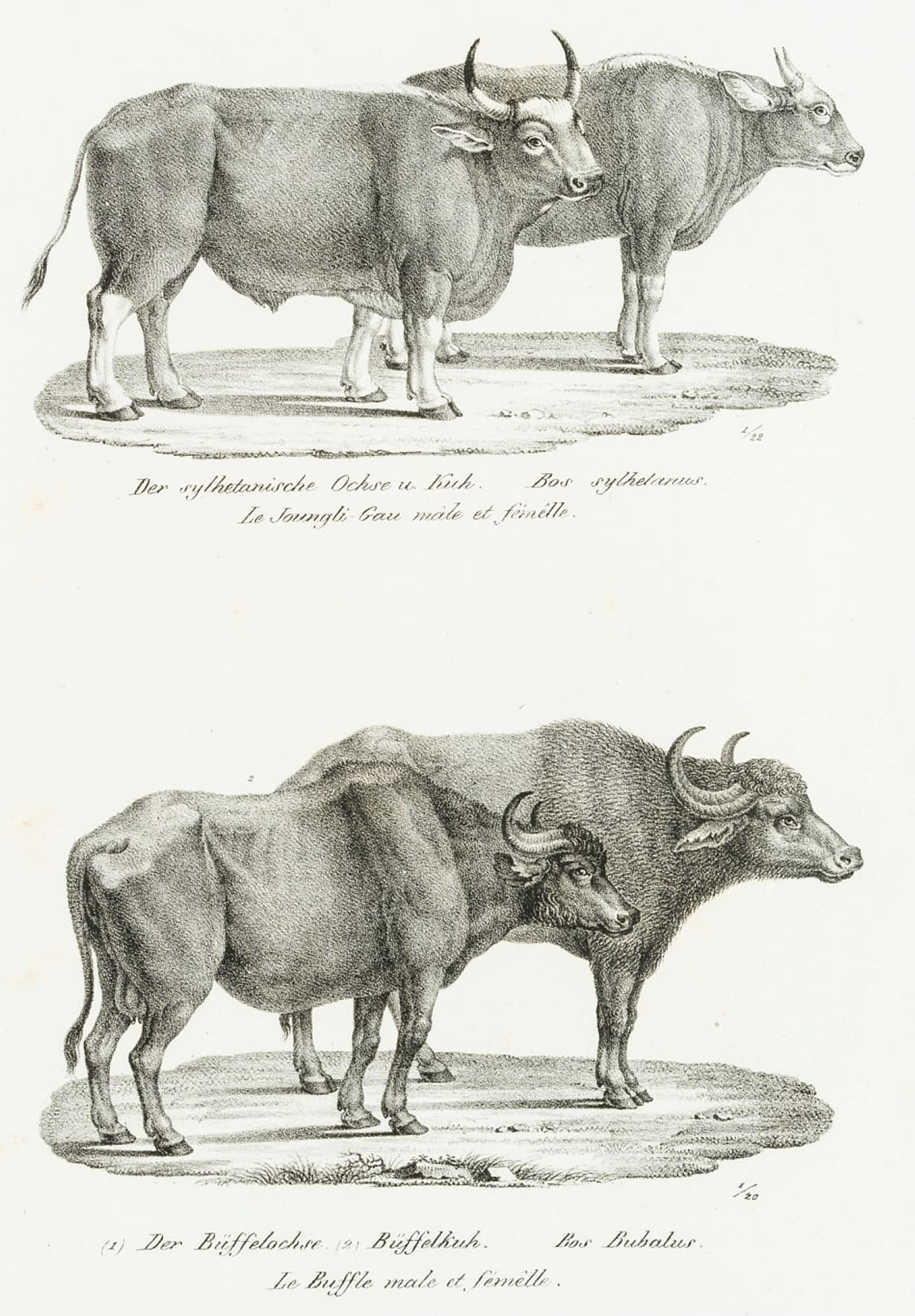 - Bezeichnung: Unten betitelt: “Der Sylhetanische Ochse u. Kuh. Bos sylhetanus. Le Joungli-Gau mâle et fémêlle.” und “(1) Der Büffelochse. (2) Büffelkuh. Bos Bubalus. Le Buffle male et fémêlle.”