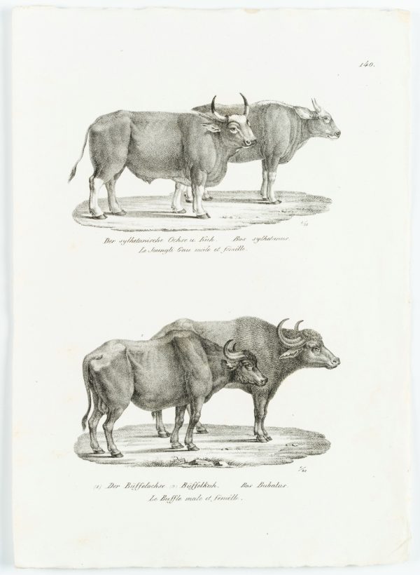 - Bezeichnung: Unten betitelt: „Der Sylhetanische Ochse u. Kuh. Bos sylhetanus. Le Joungli-Gau mâle et fémêlle.“ und „(1) Der Büffelochse. (2) Büffelkuh. Bos Bubalus. Le Buffle male et fémêlle.“