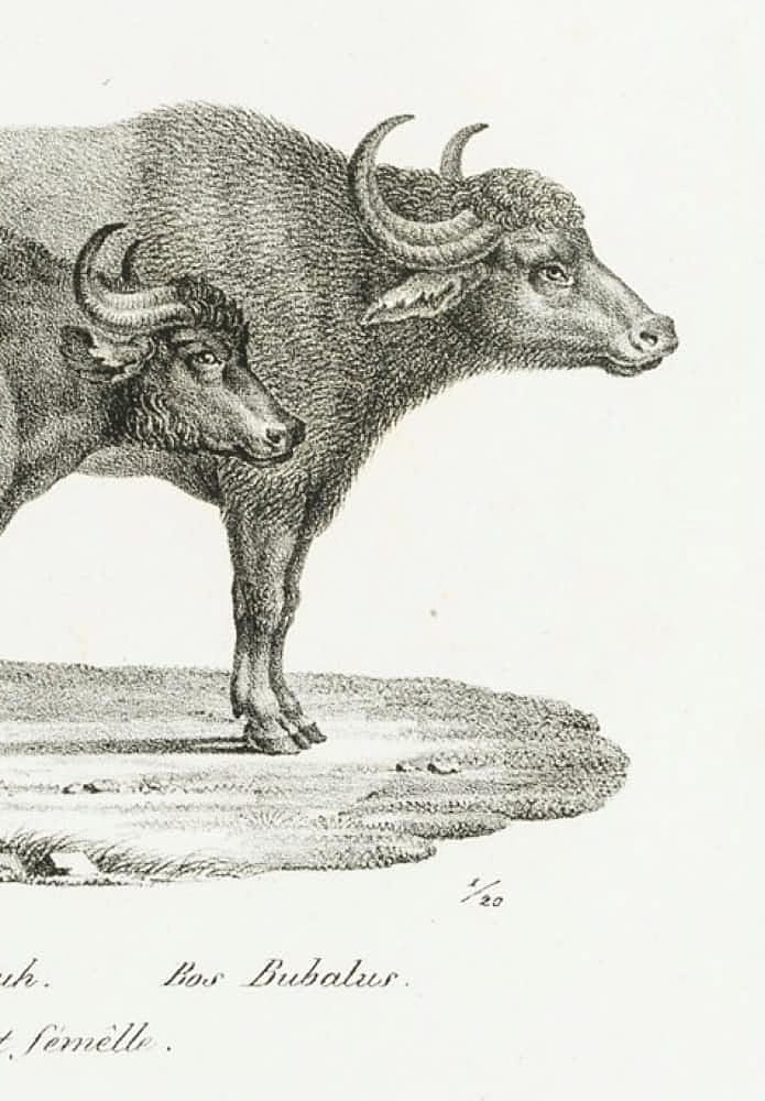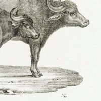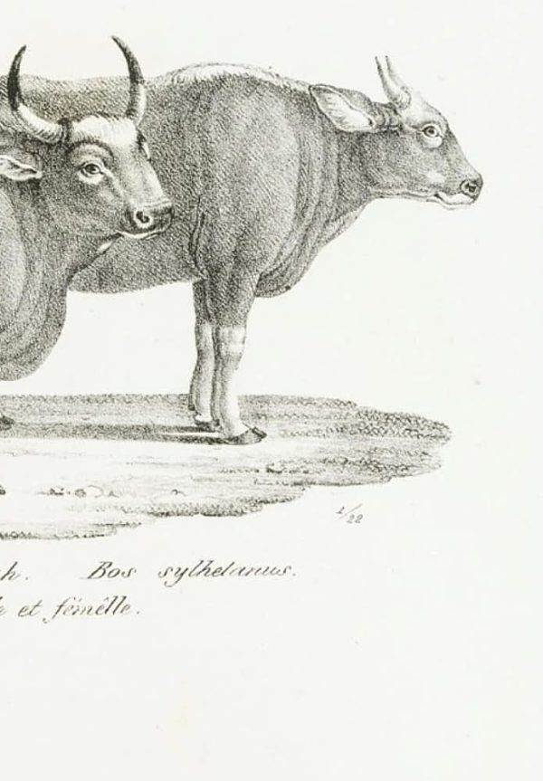- Inscription: Titled at the bottom: “The Sylhetan Ox and Cow. Bos sylhetanus. Le Joungli-Gau mâle et fémêlle.” and “(1) The buffalo ox. (2) Buffalo cow. Bos Bubalus. Le Buffle male et fémêlle.”
