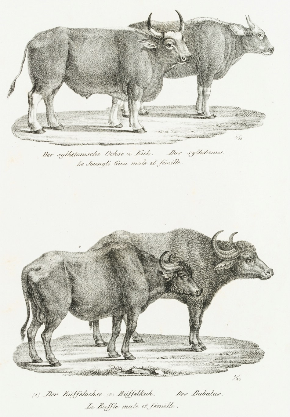 - Inscription: Titled at the bottom: „The Sylhetan Ox and Cow. Bos sylhetanus. Le Joungli-Gau mâle et fémêlle.“ and „(1) The buffalo ox. (2) Buffalo cow. Bos Bubalus. Le Buffle male et fémêlle.“