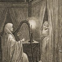 Karl Matthias Ernst (1758 Mannheim – 1830 ibid.), Book illustration, harpist by candlelight, 18th century, Etching