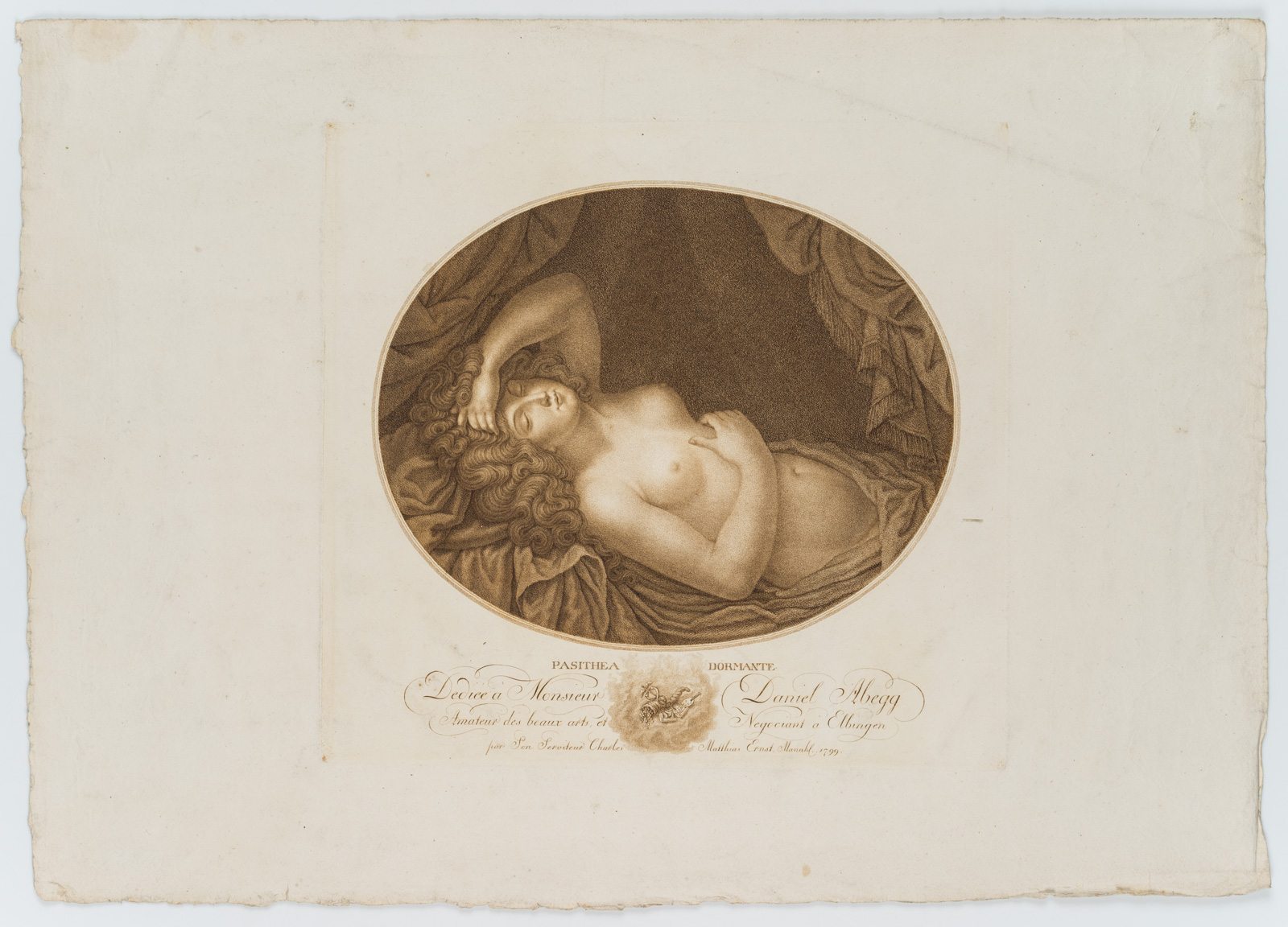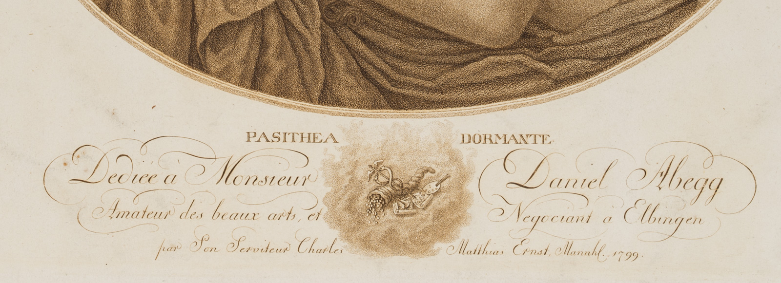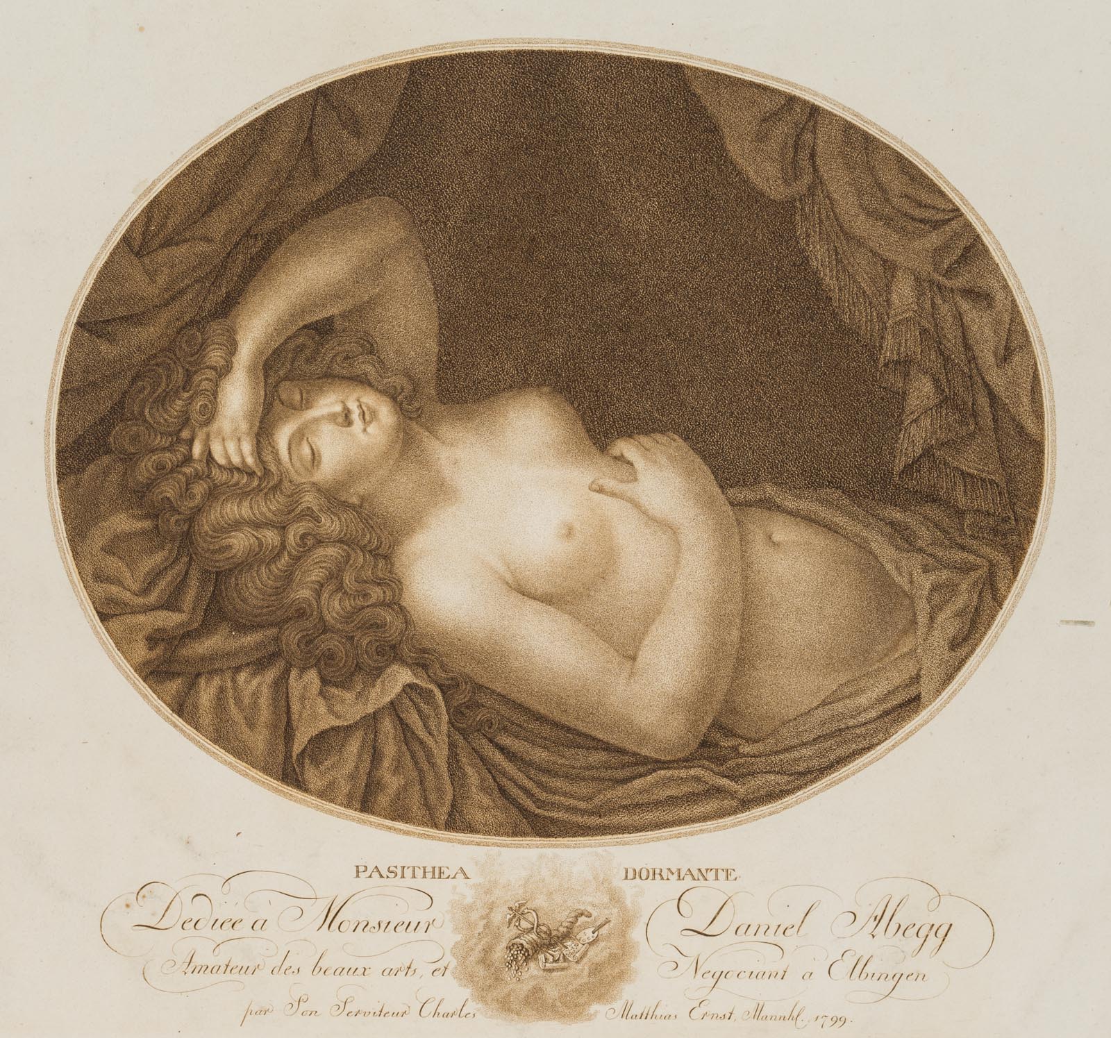 - Inscription: Inscribed, signed and dated in the printing plate below the oval-framed image: “Pasithea Dormante | Dedieé Monsieur Daniel Albegg Amateur des beaux arts, et Negociant à Elbingen par Son Serviteur Charles Matthias Ernst, Mannhl. 1799.”. On the reverse is the collection stamp “A.R” (Lugt 4401).