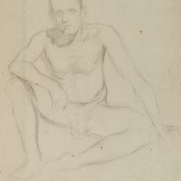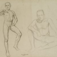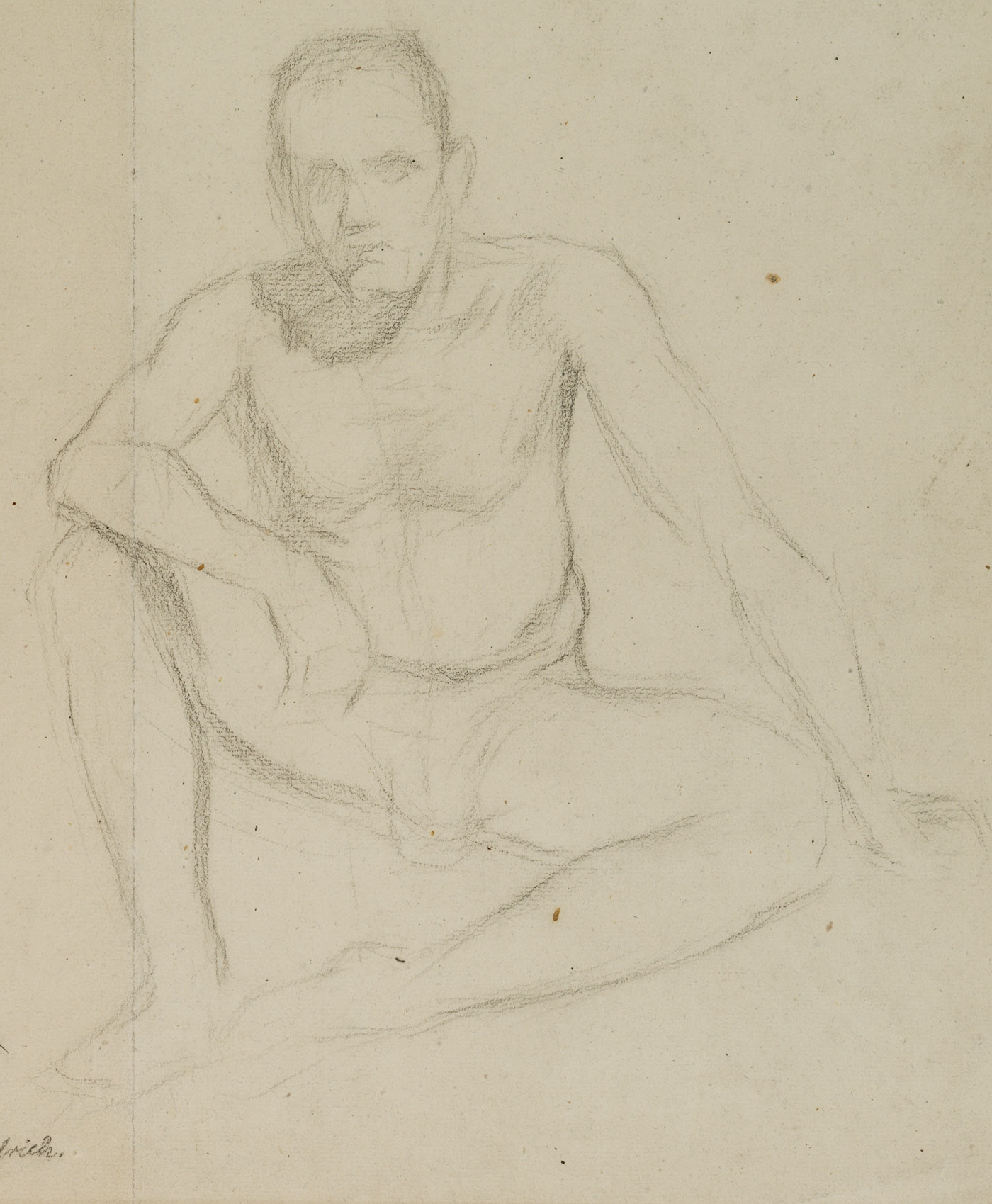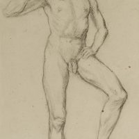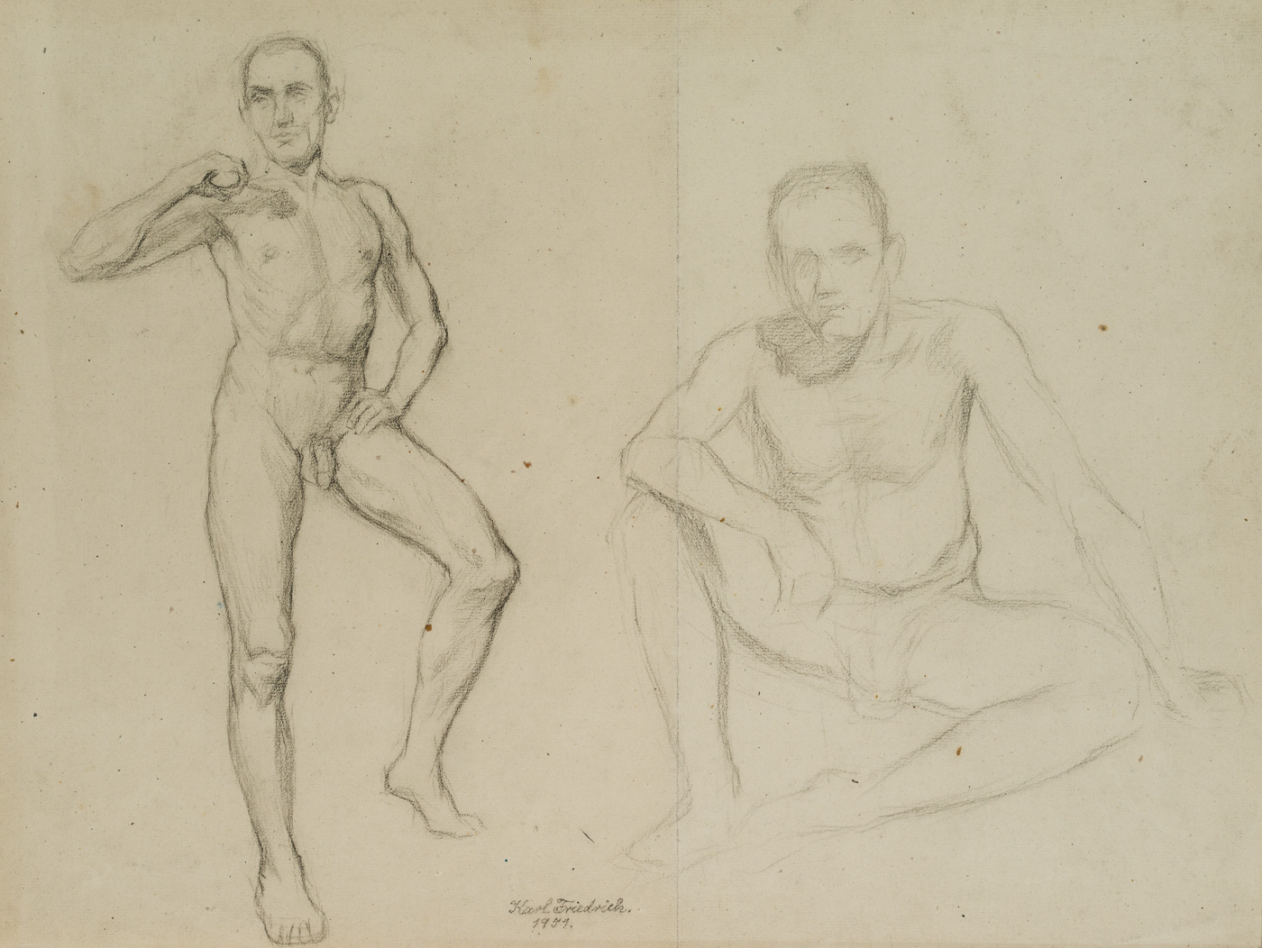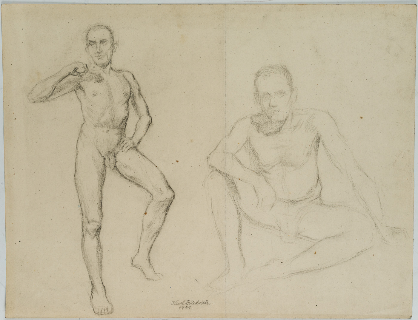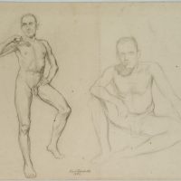 - Description: Studies of a male nude standing and sitting. The standing figure on the left is shown in three-quarter view, the left foot resting on a pedestal. While the left arm rests on the thigh, the man has formed his right hand into a circle and is looking out of the pictorial space over his left shoulder.