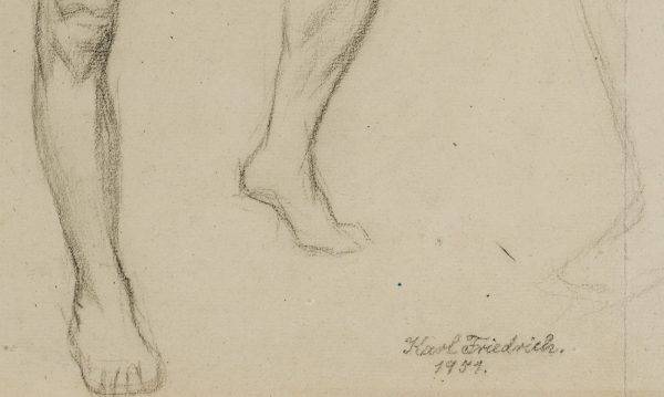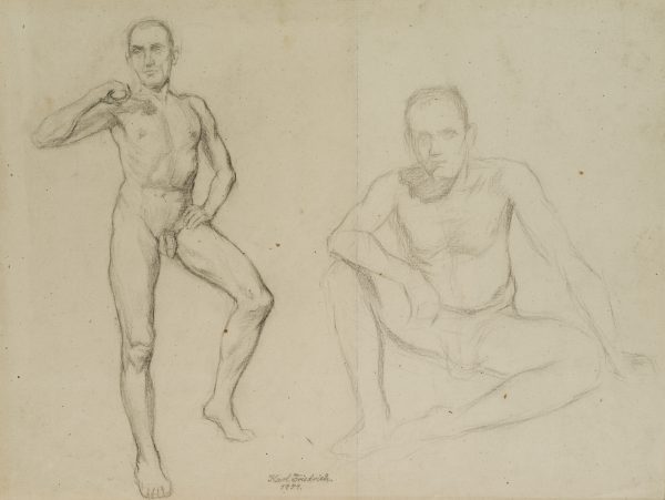 - Inscription: Lower right signed: “Karl Friedrich”. Lower right dated: “1951”. On the right the man is shown sitting, his arm resting on his right knee.