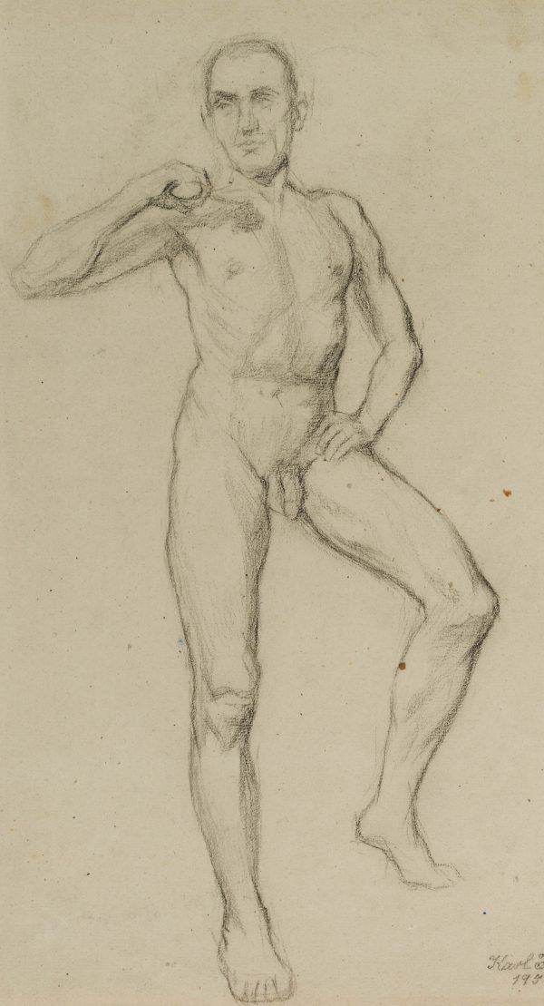 - Beschreibung: Studien eines männlichen Aktes im Stehen und im Sitzen. Die linke stehende Figur ist in Dreiviertelansicht dargestellt, der linke Fuß ruht auf einem Podest. Während der linke Arm auf dem Oberschenkel ruht, hat der Mann seine rechte Hand zu einem Kreis geformt und blickt über seine linke Schulter aus dem Bildraum heraus.
