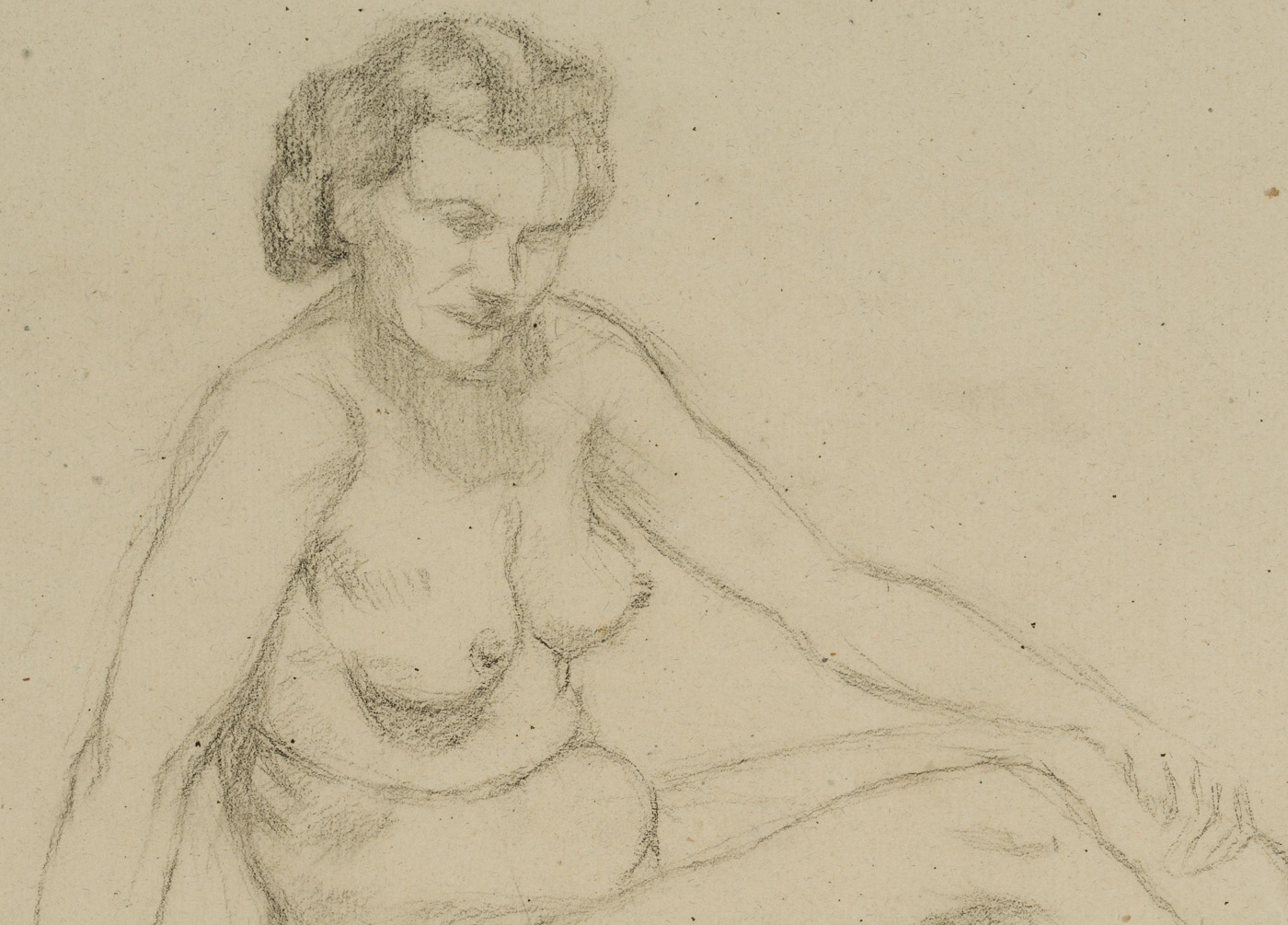 - Beschreibung: Im Querformat der Darstellung erblicken die Betrachtenden einen sitzenden weiblichen Akt. Die Frau, deren Beine ausgestreckt und leicht angewinkelt sind, hat ihren linken Arm auf ihrer Wade abgelegt. Mit dem rechten Arm stützt sie sich ab, während ihr Rücken leicht gekrümmt ist. Ihr Kopf ist gesenkt und sie scheint so den Blicken der Betrachtenden zu entgegnen.