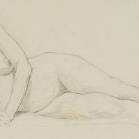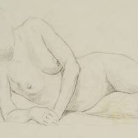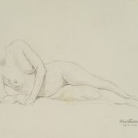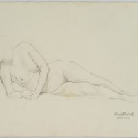 - Description: Lying sideways on a cushion, the viewers recognise a female nude. Leaning on her right bent arm, the woman has her legs slightly bent. While her body has been fully formed, her face is only schematically indicated.