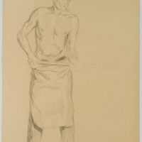 - Description: In the portrait format of the depiction, the viewers catch sight of a man standing upright. Dressed in trousers and an apron, the man wears a hat on his head. With his body slightly turned on its axis, the man is holding a stick like a shovel or similar implement. Together with his clothing, this gives the image of a worker or craftsman at work.