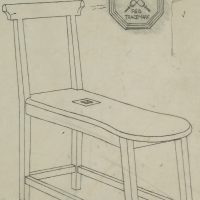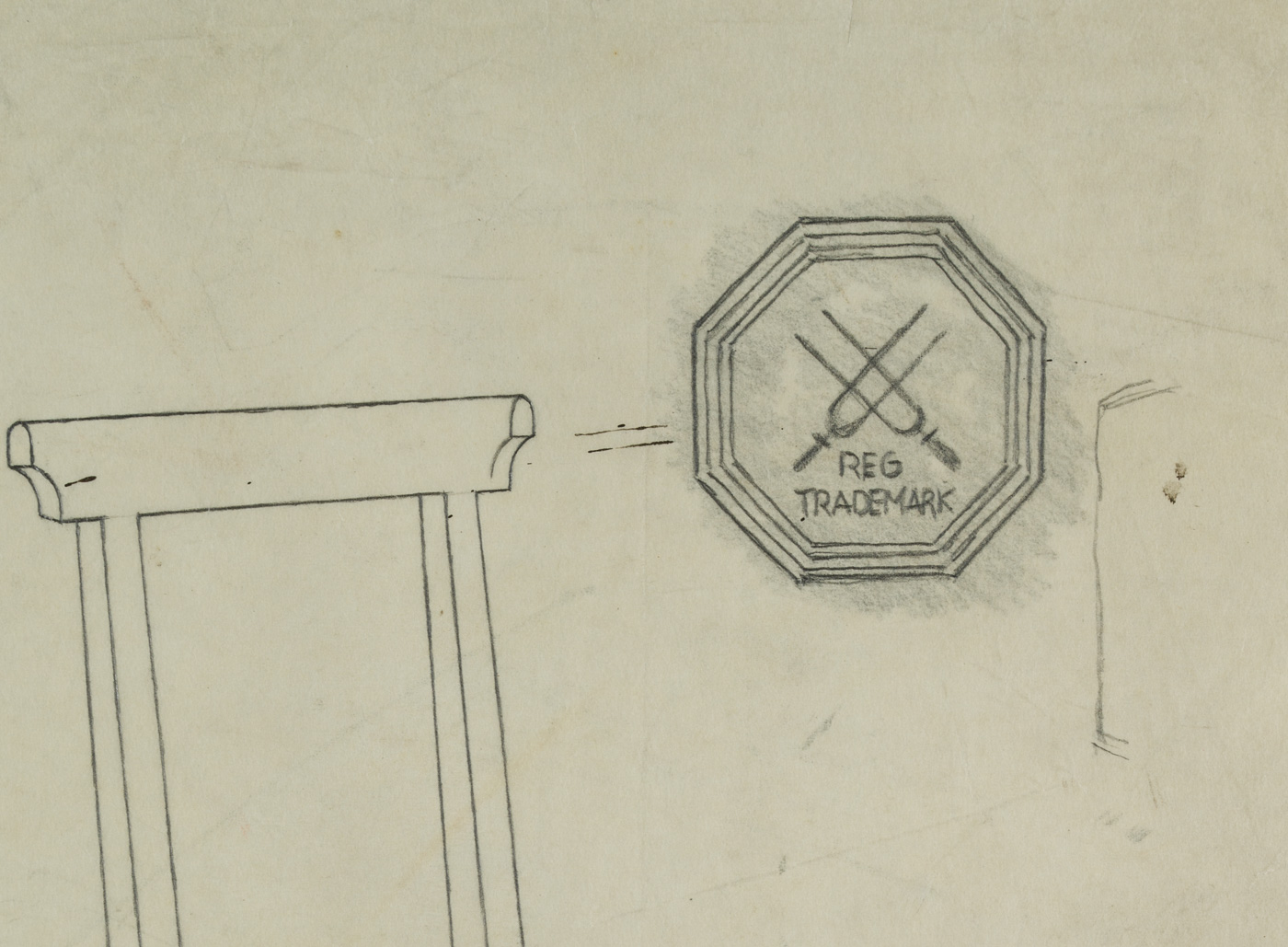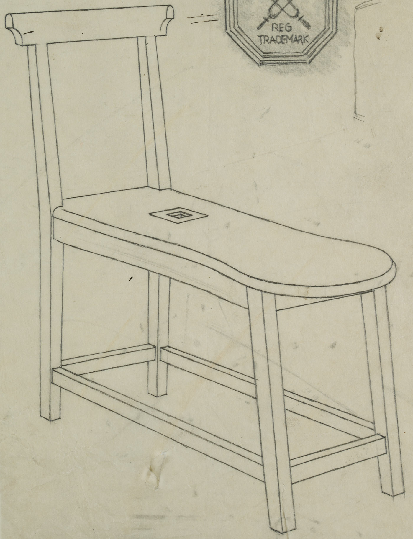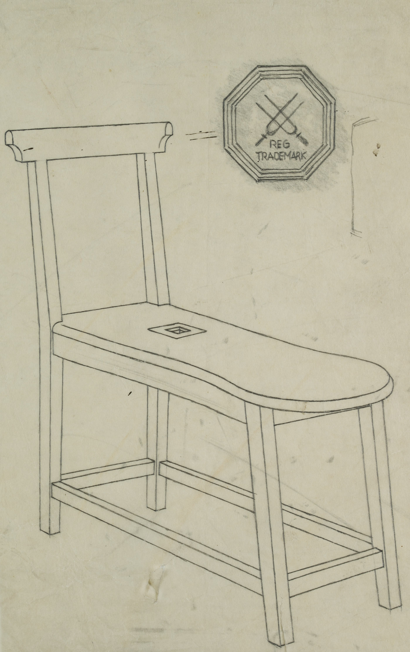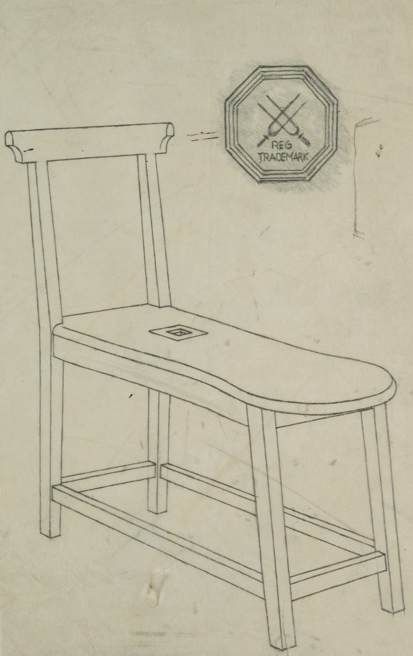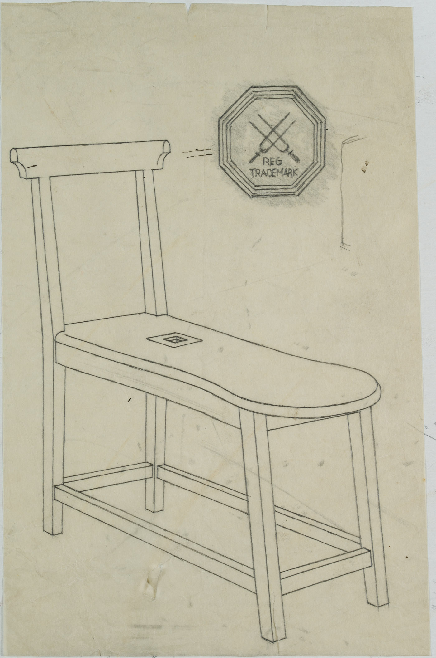 - Description: Depiction of a piece of seating furniture with an elongated, narrow seat and a square opening in the rear third of the seat. In the background a company sign showing two crossed tuning forks. Underneath it reads “Reg. Trademark”.