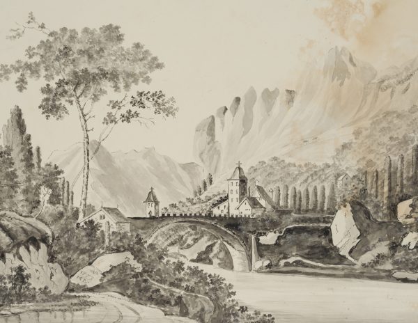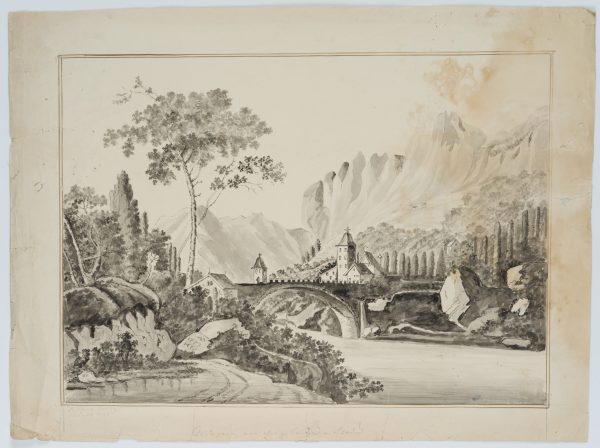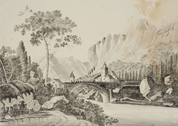 Klaas Hoog (19. Jahrhundert), Alpenfluss mit Ortschaft am Fuß einer Gebirgskette, um 1840, Pinselzeichnung