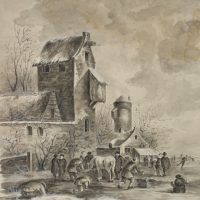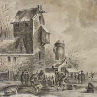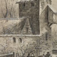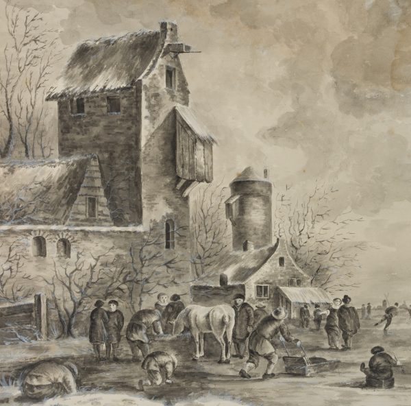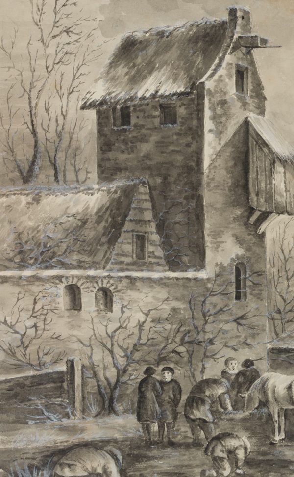 Klaas Hoog (19. Jahrhundert), Dörfliches Zusammenkommen am Brunnen vor der alten Warte, um 1840, Pinselzeichnung