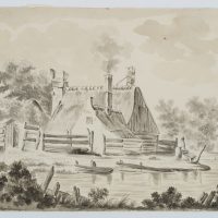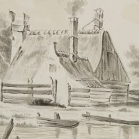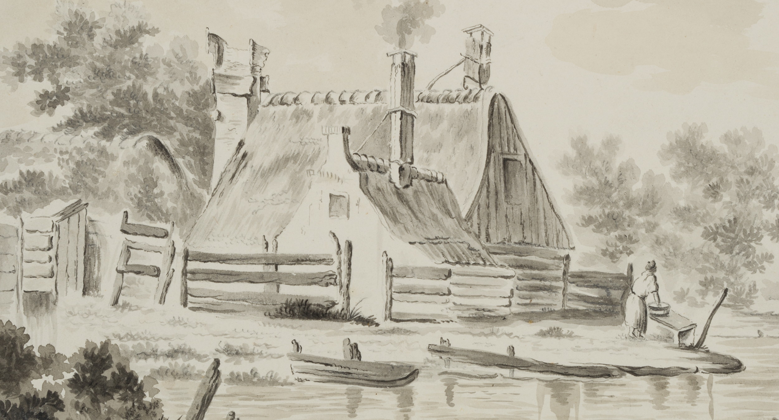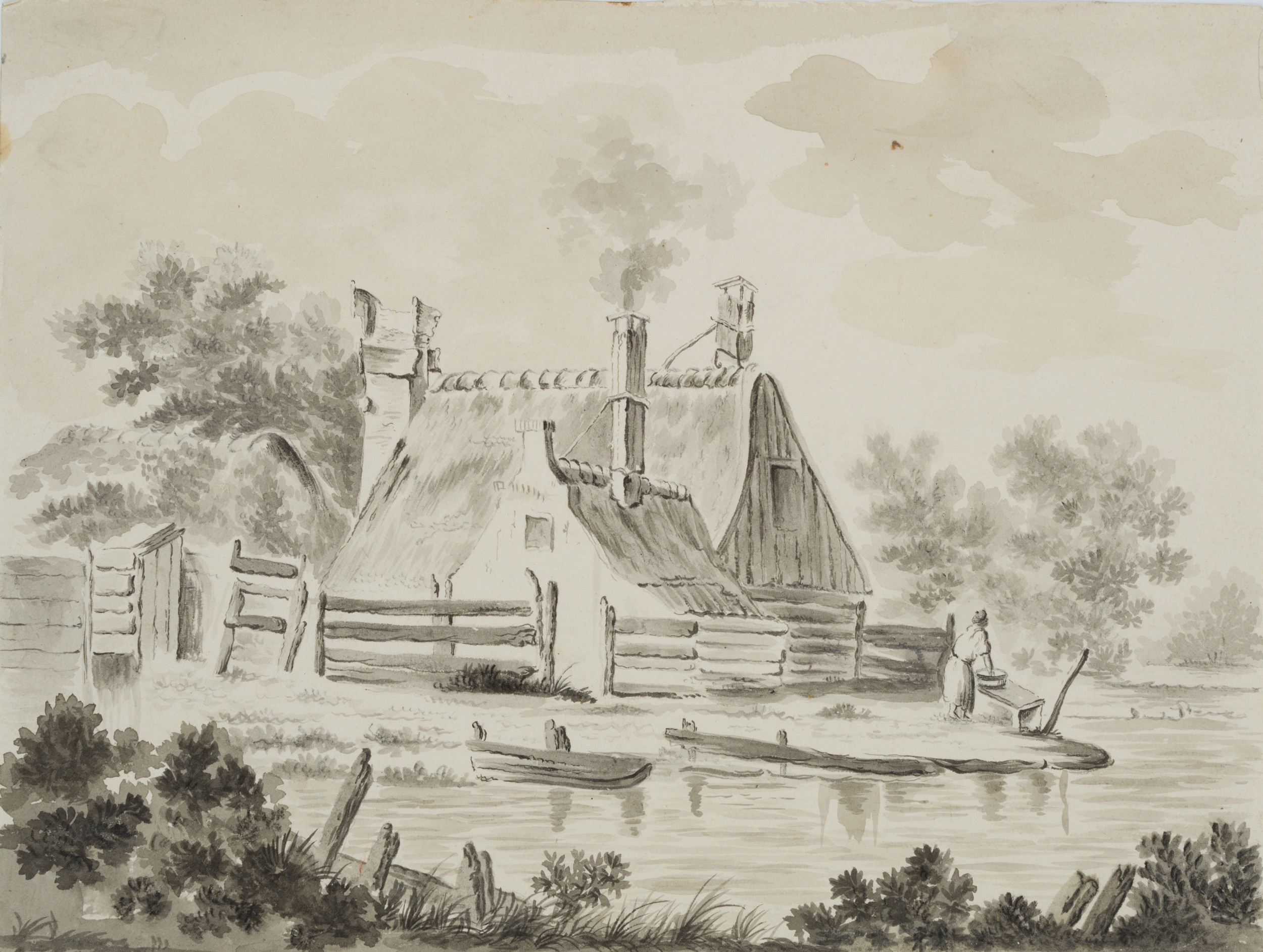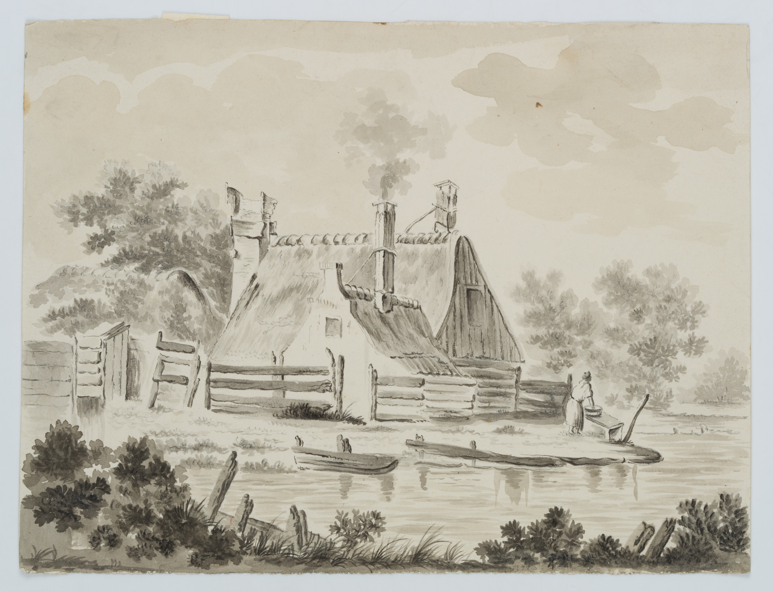 Klaas Hoog (19th century), House by the lake with laundress, c. 1840, Brush drawing