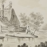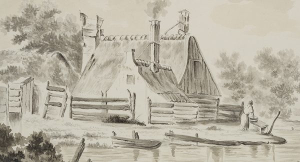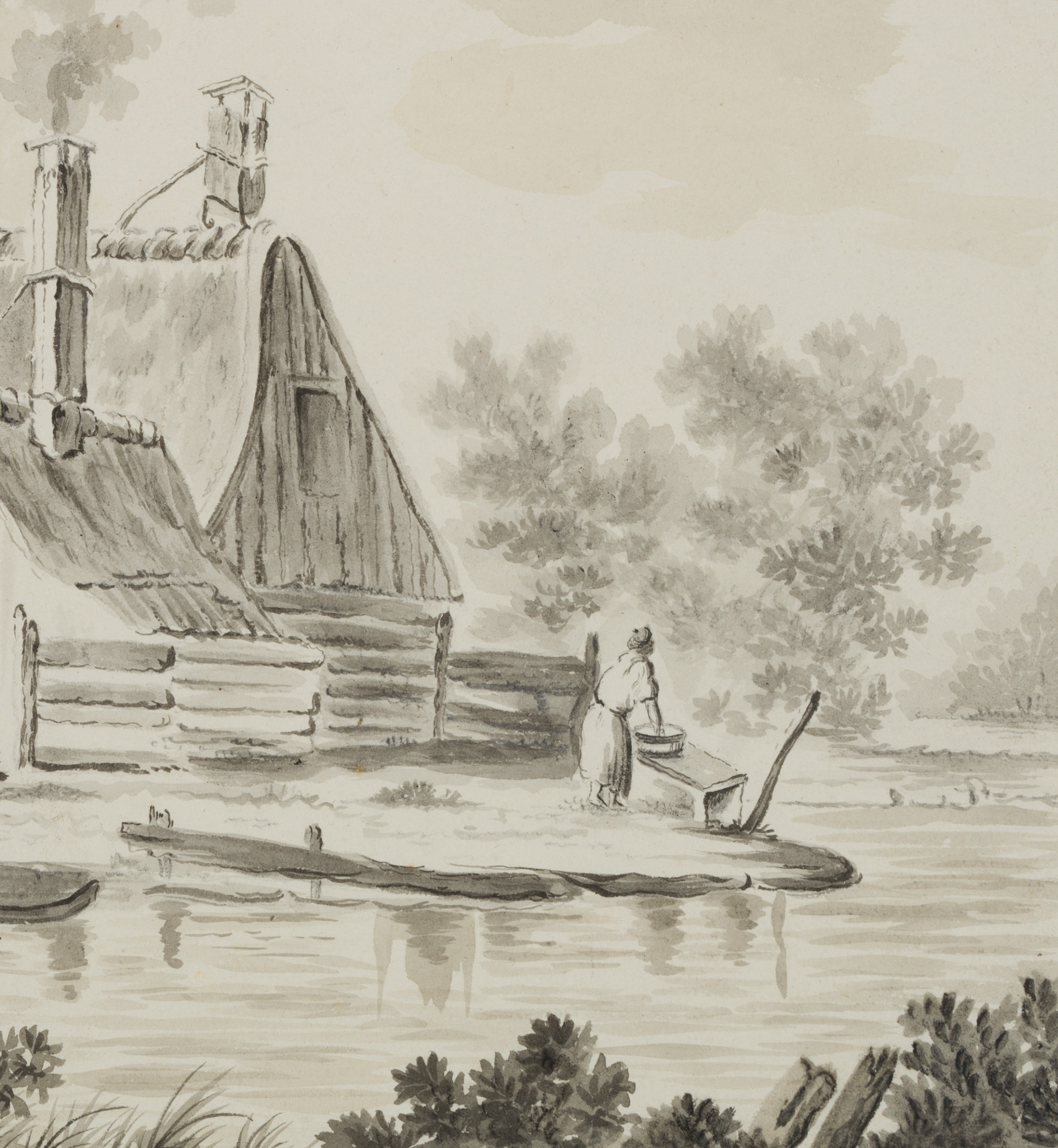 Klaas Hoog (19. Jahrhundert), Haus am See mit Wäscherin, um 1840, Pinselzeichnung