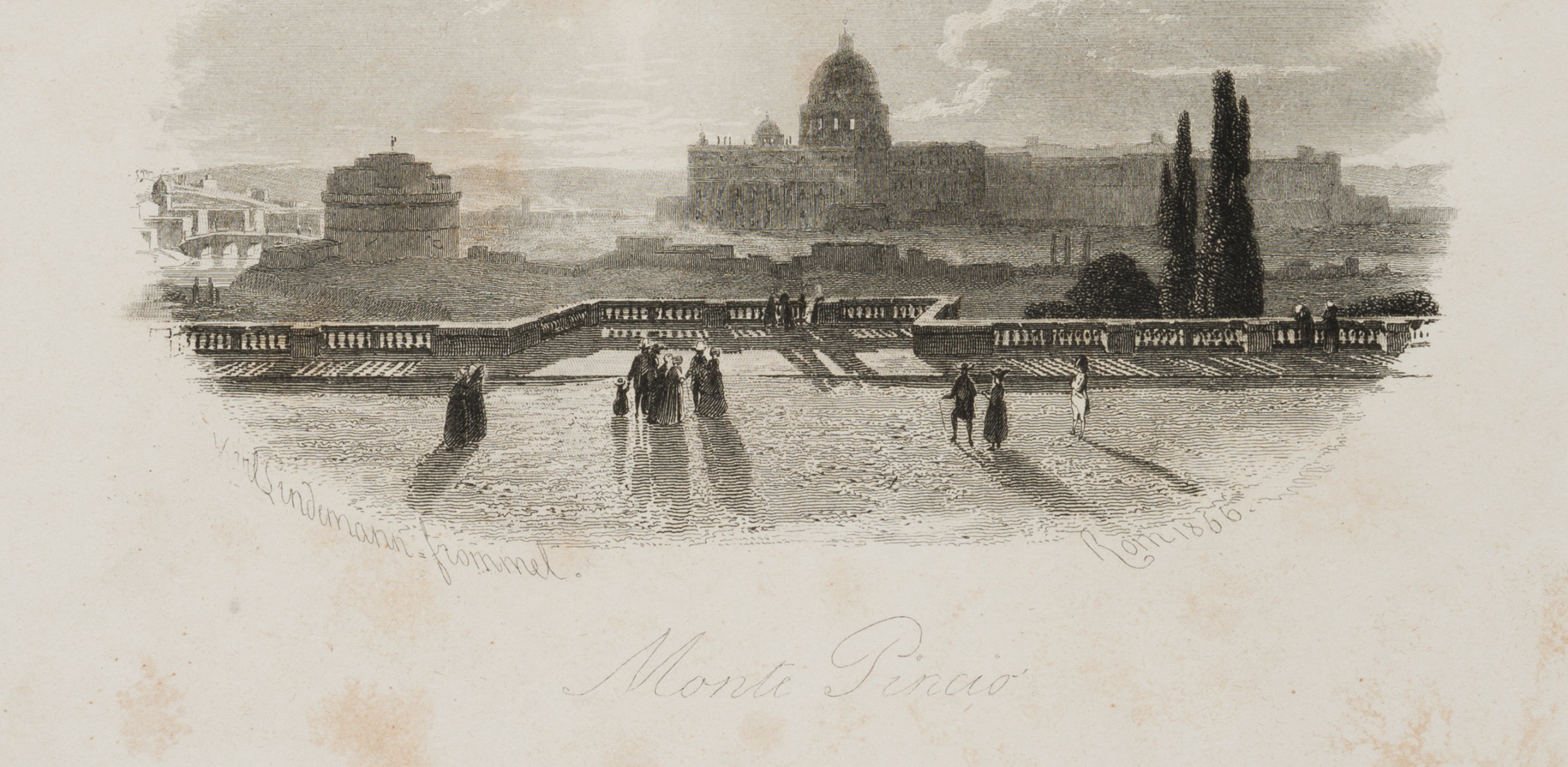 - Bezeichnung: Unten mittig im Druck signiert: “Karl Lindemann Frommel | Rom 1866”. Unten mittig im Druck bezeichnet: “Monte Pincio”.