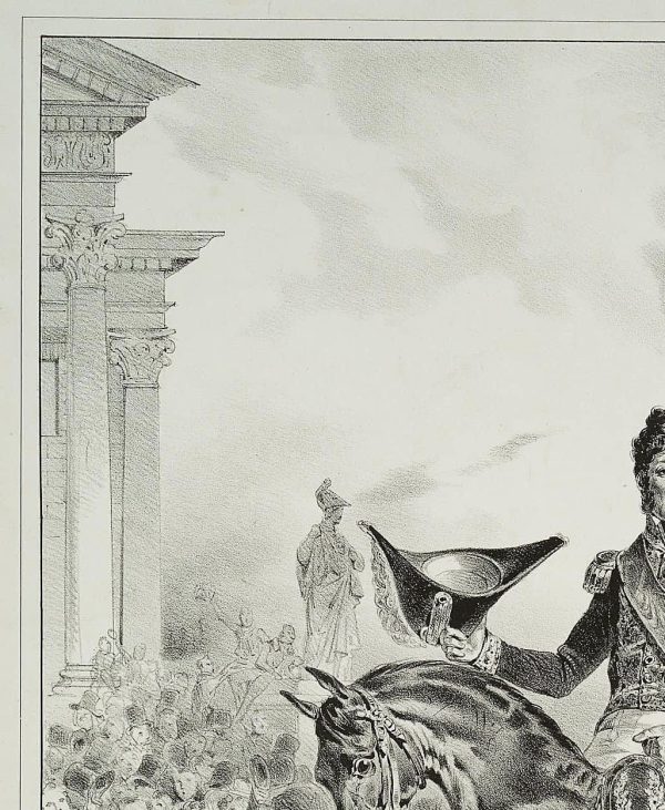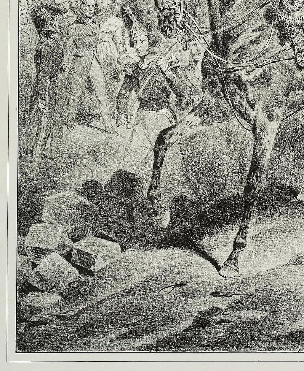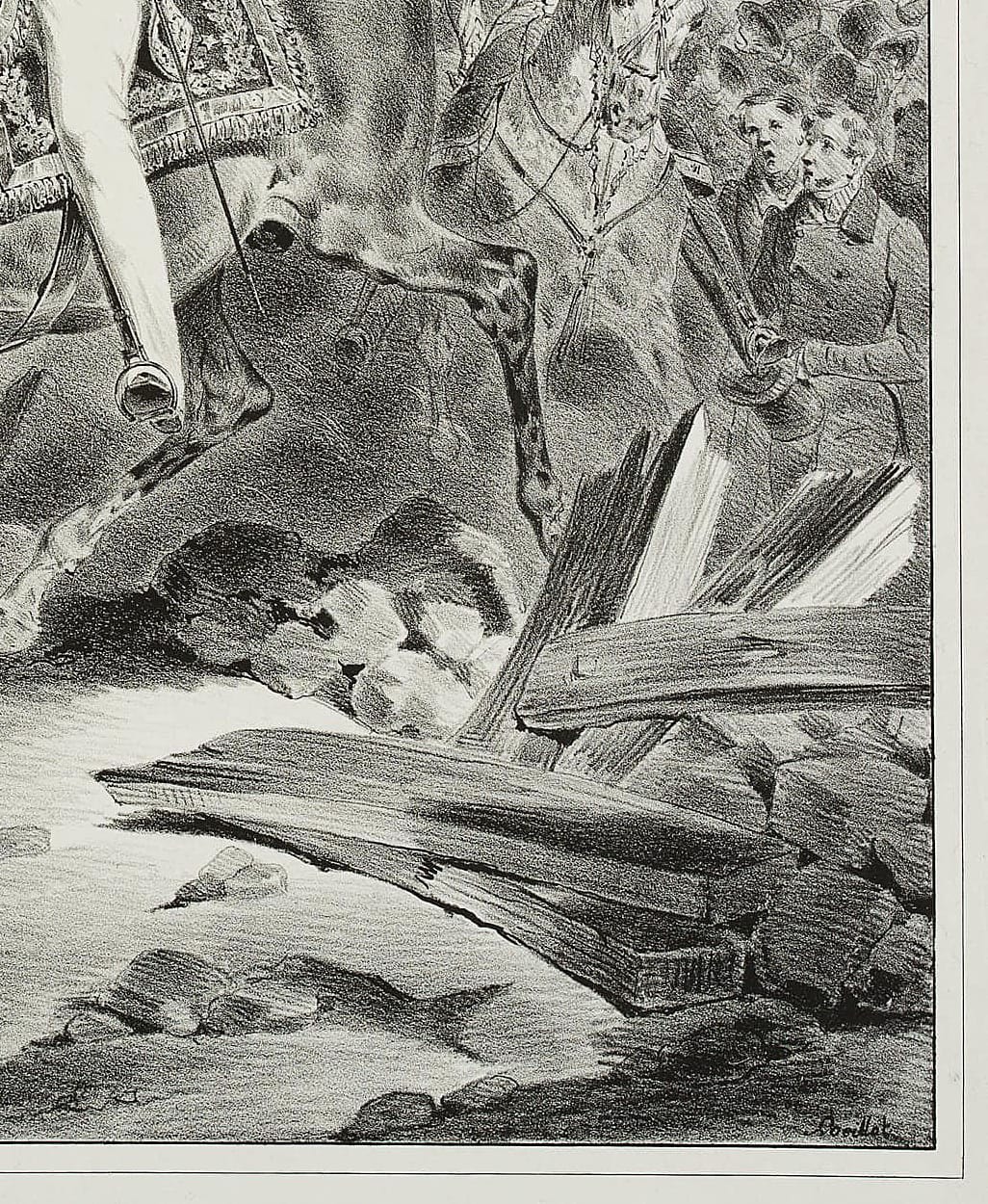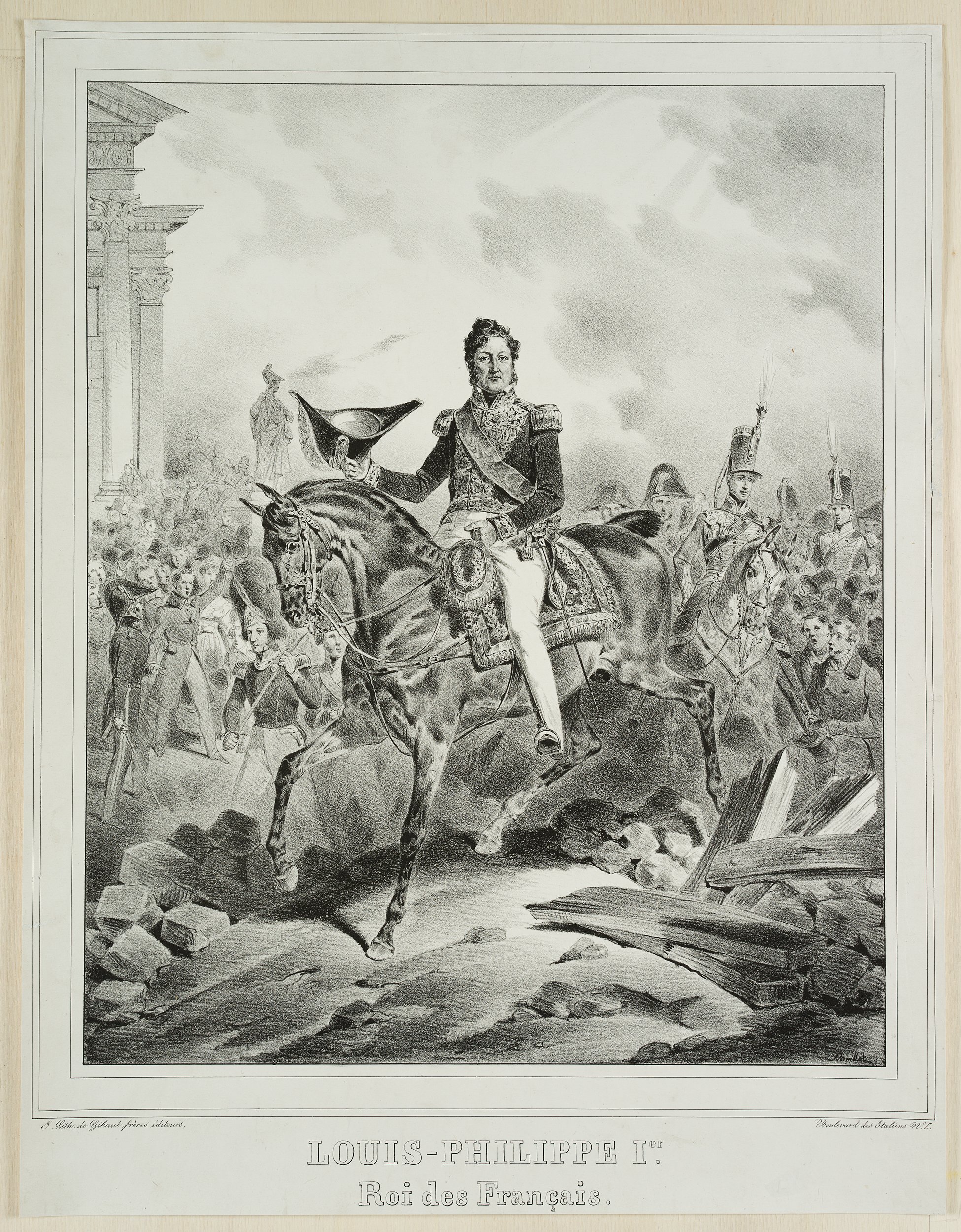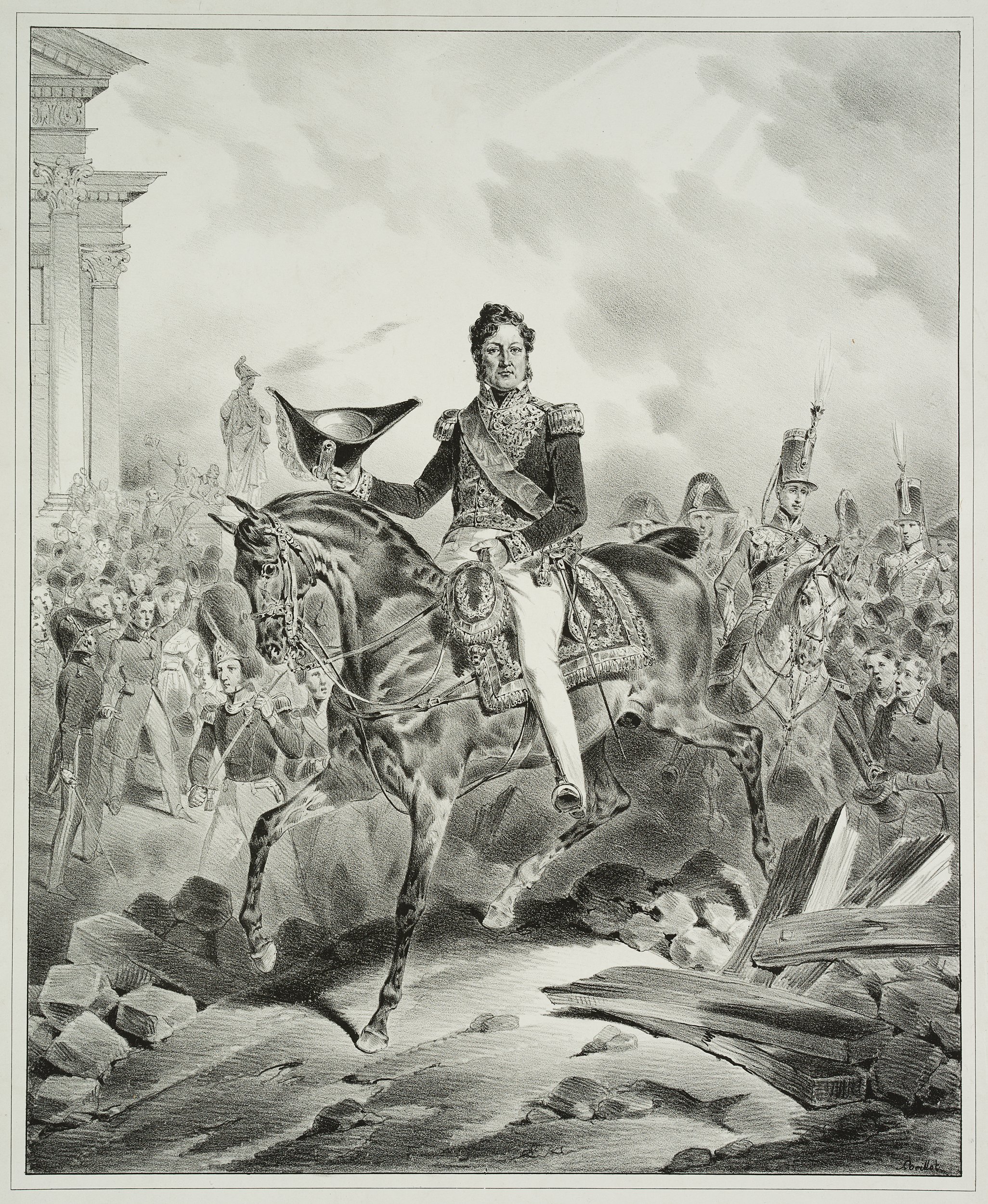 - Beschreibung: Hatte der vor allem als Lithograph bekannte Karl Loeillot-Hartwig mit dem Blatt Der Kaiser pflügt eine Furche (ca. 1823) nicht nur zum Kult des Exilanten beigetragen, sondern auch die Verbindung zwischen guter Regierung und der bereits vorrevolutionären Forderung nach Agrarreformen mahnend vor Augen gestellt, so liefert er mit dieser Lithographie eine Apotheose des sogenannten Bürgerkönigs. Louis-Philippe I. reitet über die Barrikaden der Juli-Revolution von 1830, die ihn an die Macht gebracht hat, umringt von Soldaten und einfachen Bürgern, die ihm zujubeln. Wenngleich einzelne erregte Mienen eine Reminiszenz an die zurückliegenden Unruhen bilden, zeigt die Masse des Volkes huldigende Gesten. Loeillot steigert diese Szene zu einer Epiphanie des Königs, indem er Pferd und Reiter präzise und kontrastreich von freier gezeichneten und gröber schraffierten Partien abhebt. Bedeutungsträchtig erscheint zudem die von einem Podium herabblickende Athenastatue. In der Tat wird erst durch den Rückgriff auf klassische Bildformeln das Ausmaß an symbo-lischer Überhöhung des Monarchen verständlich. Während der römische Imperator über die Körper besiegter Feinde hinweg ritt, ist es hier der neue König, der als Garant für Ordnung und Wohlstand über die Zeichen der Unordnung triumphiert, und dies unter den Augen der Athene, der Schutzgöttin antiker Tugendhelden.