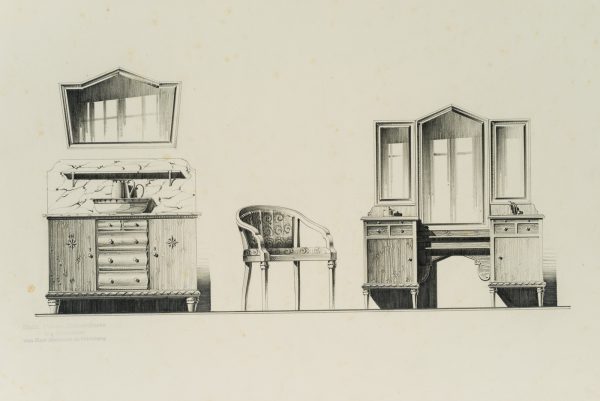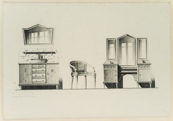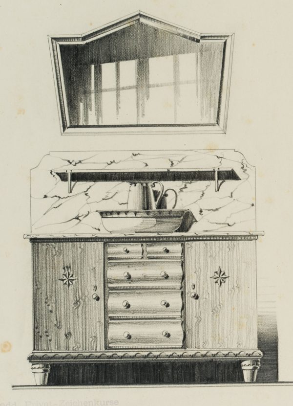 Karl Maibaum (20th century), Historicising designs of period furniture as exercises for carpenters Bathroom furniture Washstand and dressing table with mirror, Arts and Crafts, 1930s, , Pencil