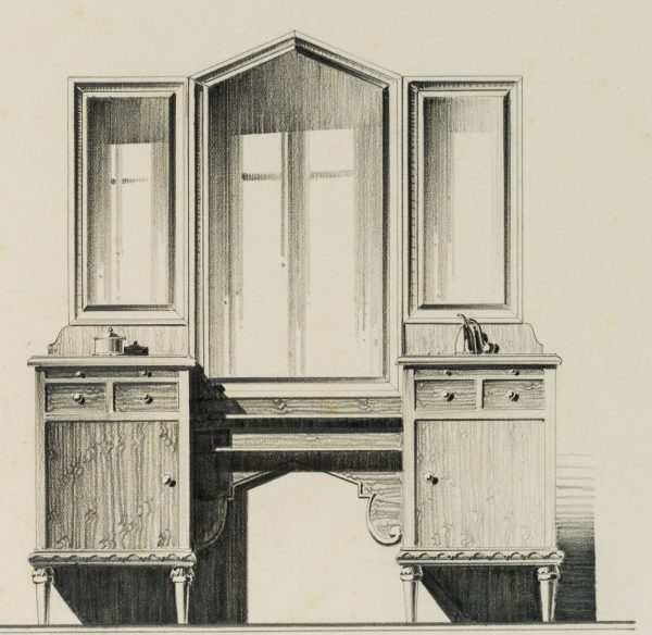 Karl Maibaum (20. Jahrhundert), Historisierende Entwürfe von Stilmöbeln als Übungen für Schreiner. Badmöbel. Waschtisch und Frisierkommode mit Spiegel, Kunsthandwerk, 1930er Jahre, , Bleistift