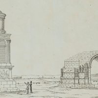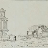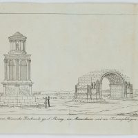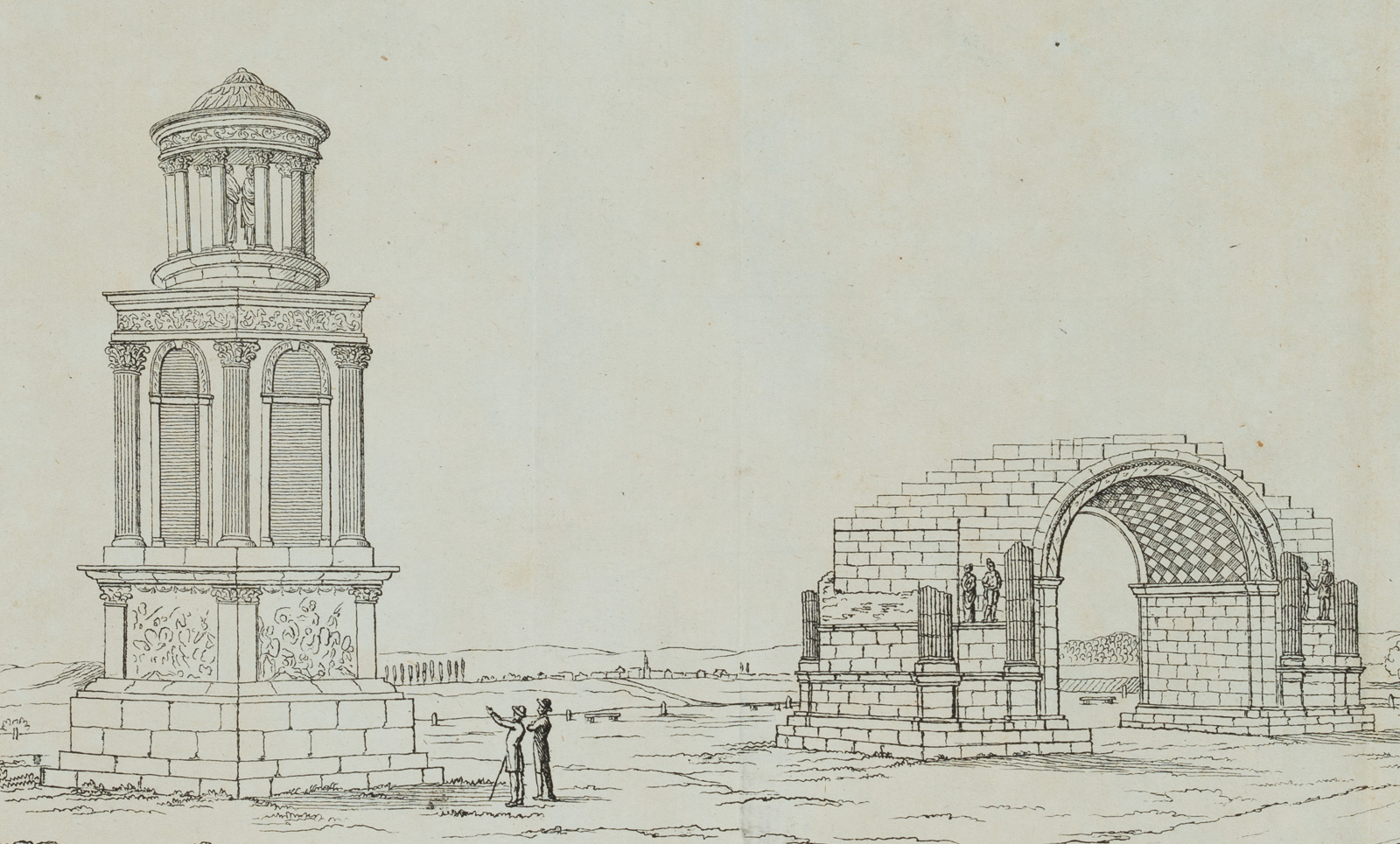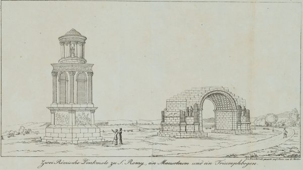 K. Müller (19th century), View of the Roman architectural ensemble ‘Les Antiques’ of Glanum near Saint-Rémy-de-Provence, triumphal arch and mausoleum, France, c. 1800, Lithography with pen