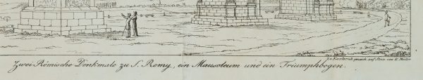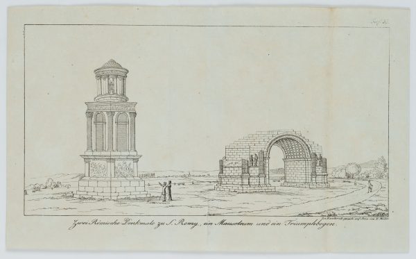 K. Müller (19. Jahrhundert), Ansicht des römischen Architekturensembles ‘Les Antiques’ von Glanum bei Saint-Rémy-de-Provence, Triumphbogen und Mausoleum, Frankreich, um 1800, Federlithographie
