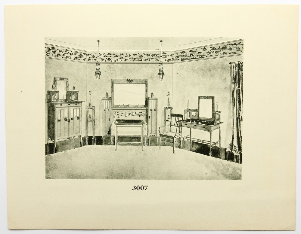 - Bezeichnung: Unterhalb der Darstellung in der Druckplatte vom Künstler signiert. Auf dem Trägerblatt ist rückseitig ein Reproduktionsdruck zu sehen auf dem ein Zimmer mit zahlreichen Spiegeln, zwei Schminktischen und einem kleinen Schrank dargestellt ist.