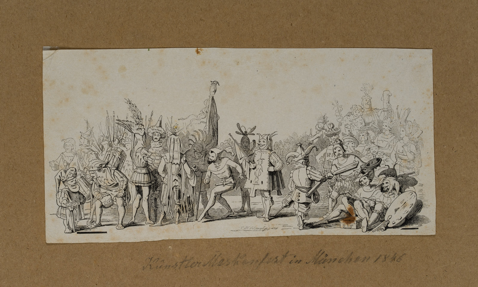 Karl Hermann Schmolze (1823 Zweibrücken – 1859 Philadelphia), Scene from the Munich Artists’ Mask Festival Colourful hustle and bustle among the costumed, 1846, Lithography