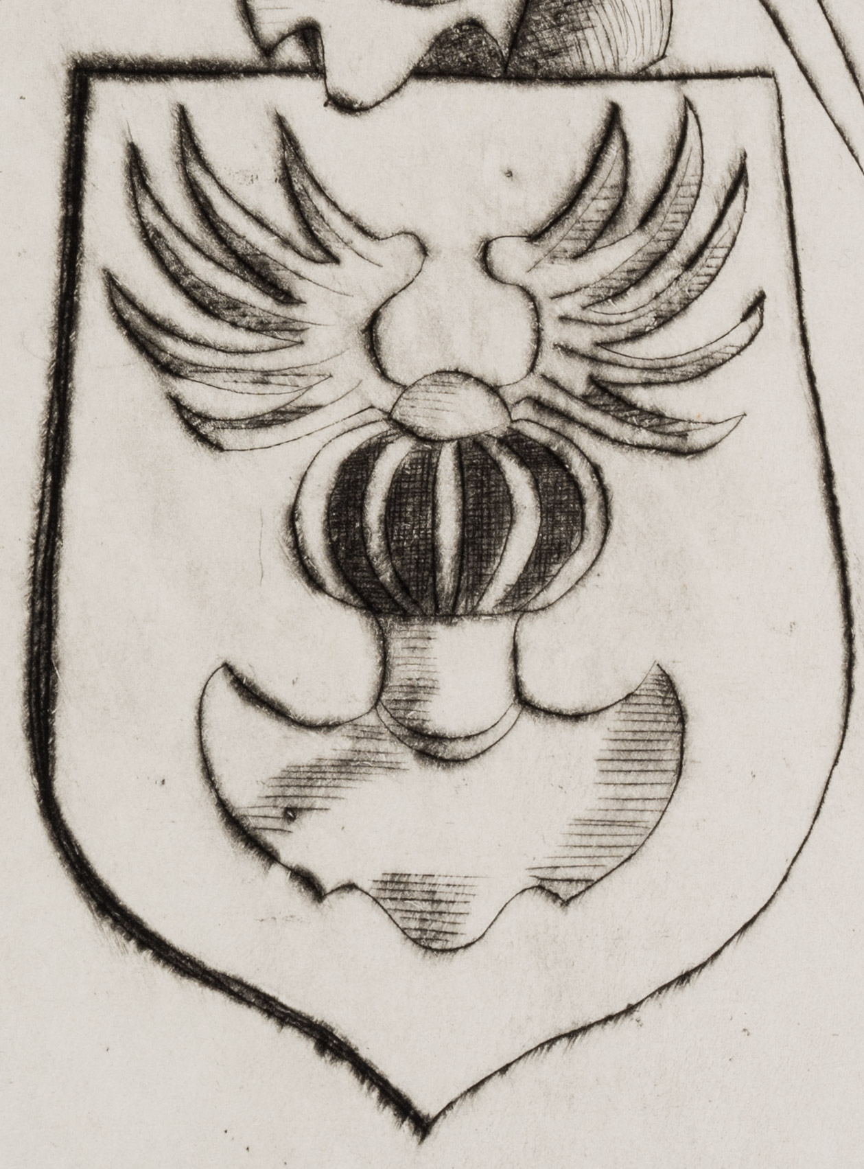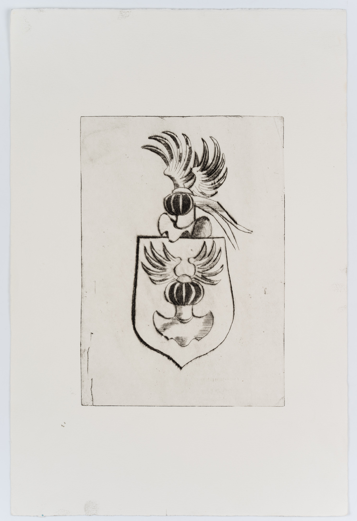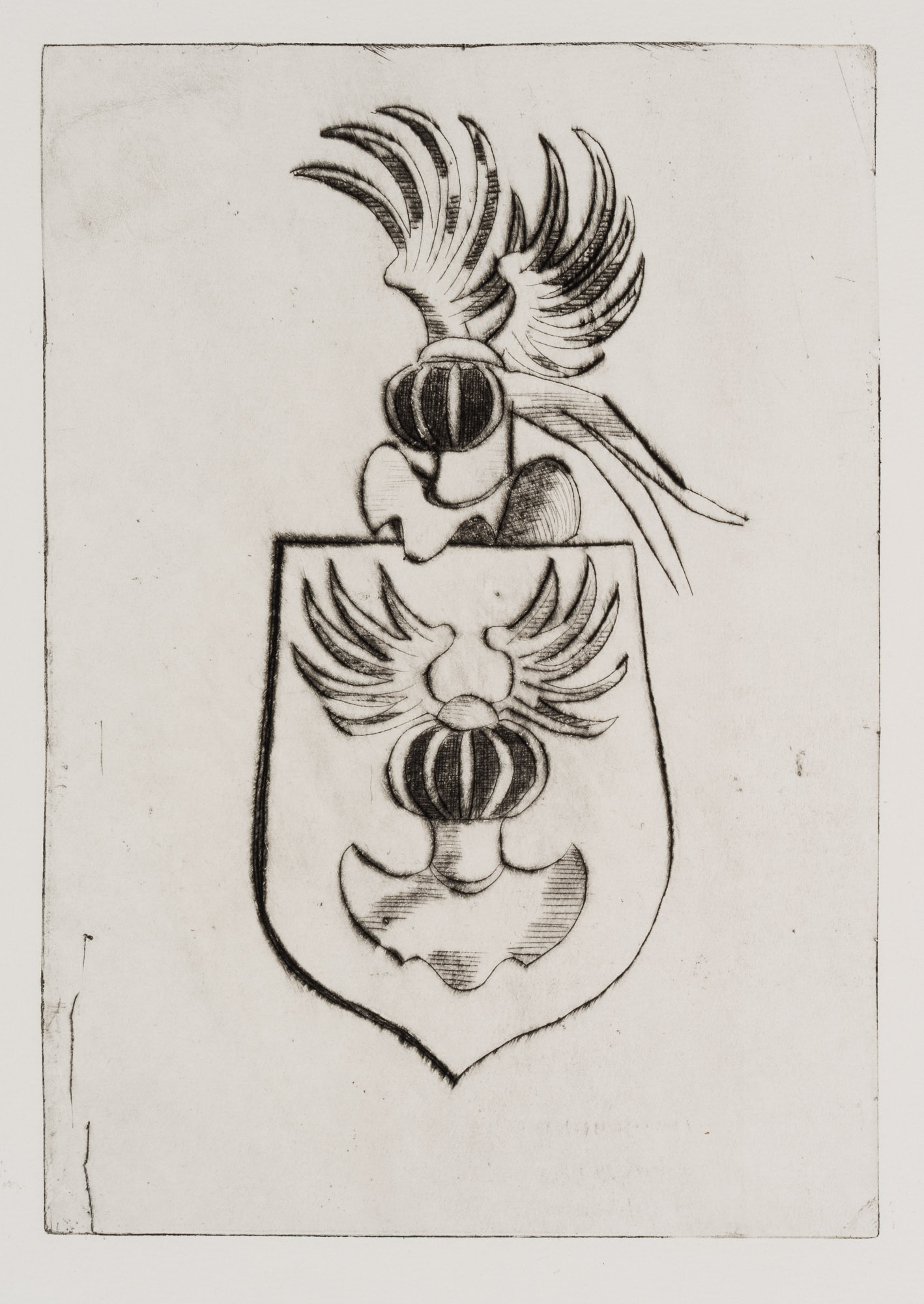 Karl Schradin (*1873 ), Satirisches Wappen, Helm mit Flügeln, 1990, Radierung