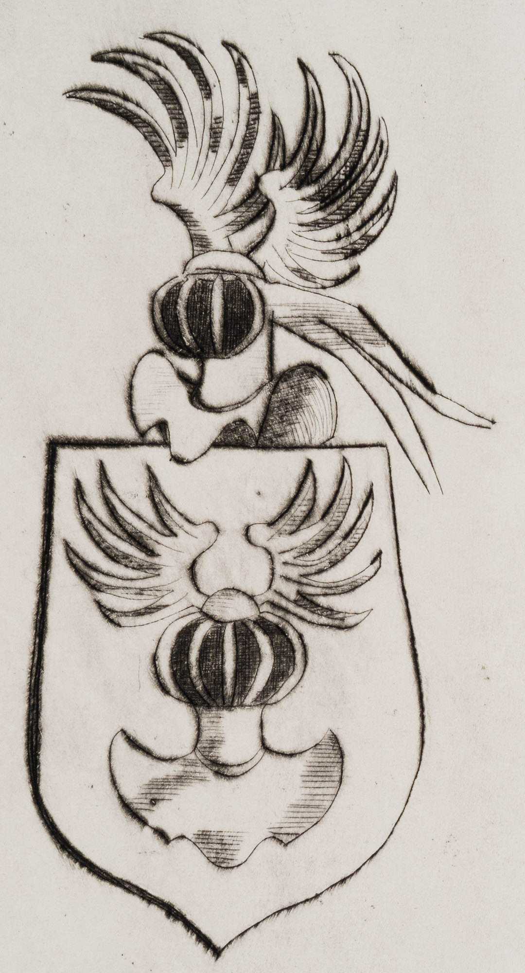 K. SCHRADIN (*1873), Satirisches Wappen, Helm mit Flügeln, 1990, Rad. Gegenstän