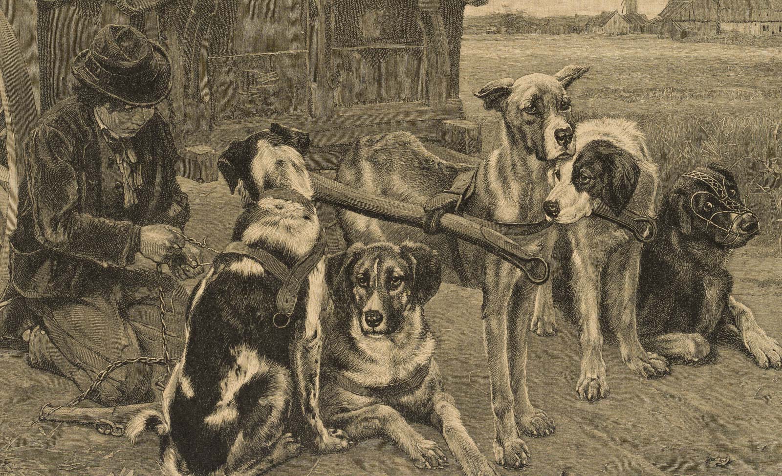 • Schlagworte: Hund, Nutztier, Zugtier, einspannen, Kutsche, Fuhrwerk, Lastenkutsche, unterwegs, Reise, Tiere, Genre, Deutschland, Hund, Realismus, 1900-1924