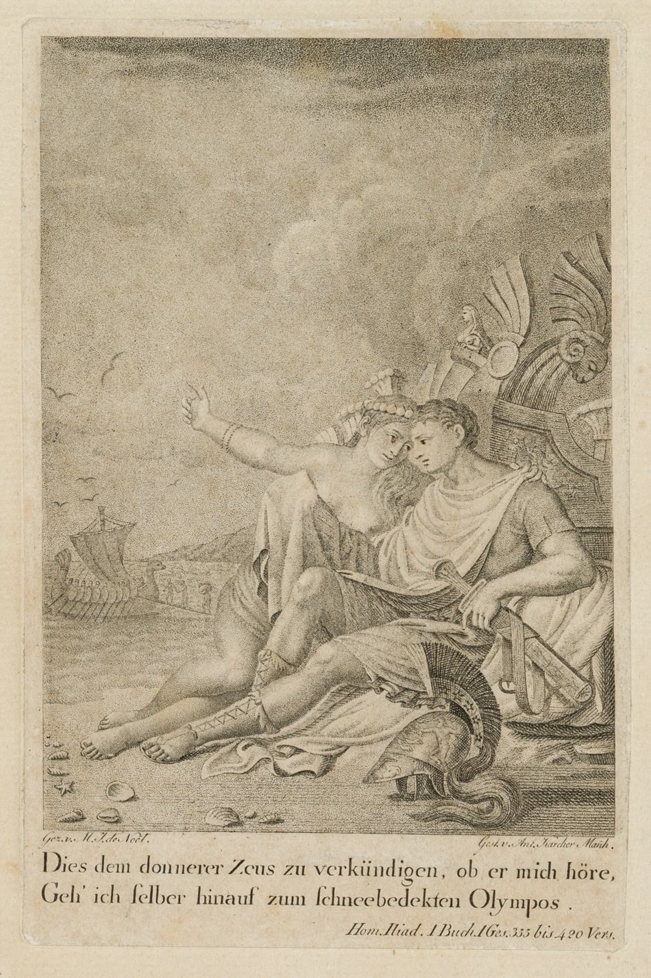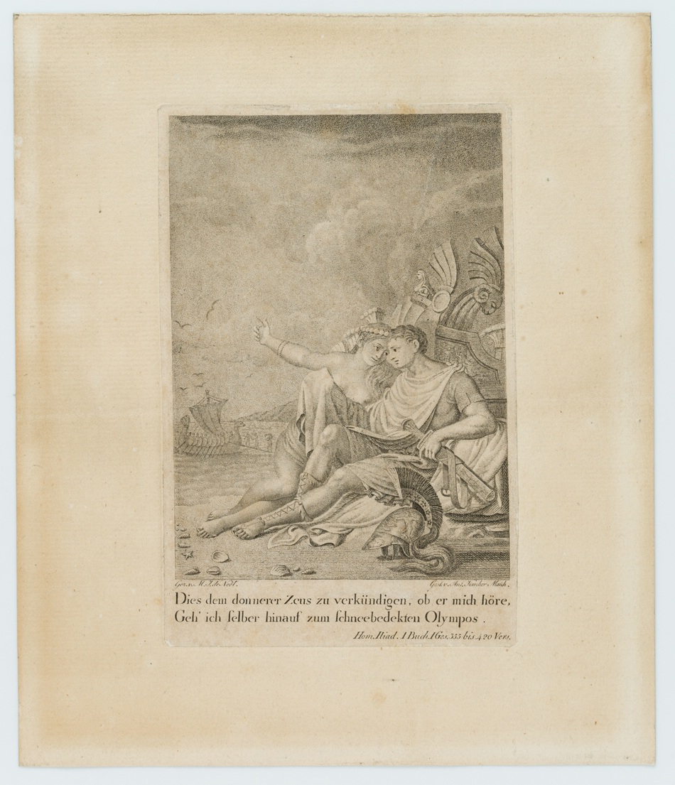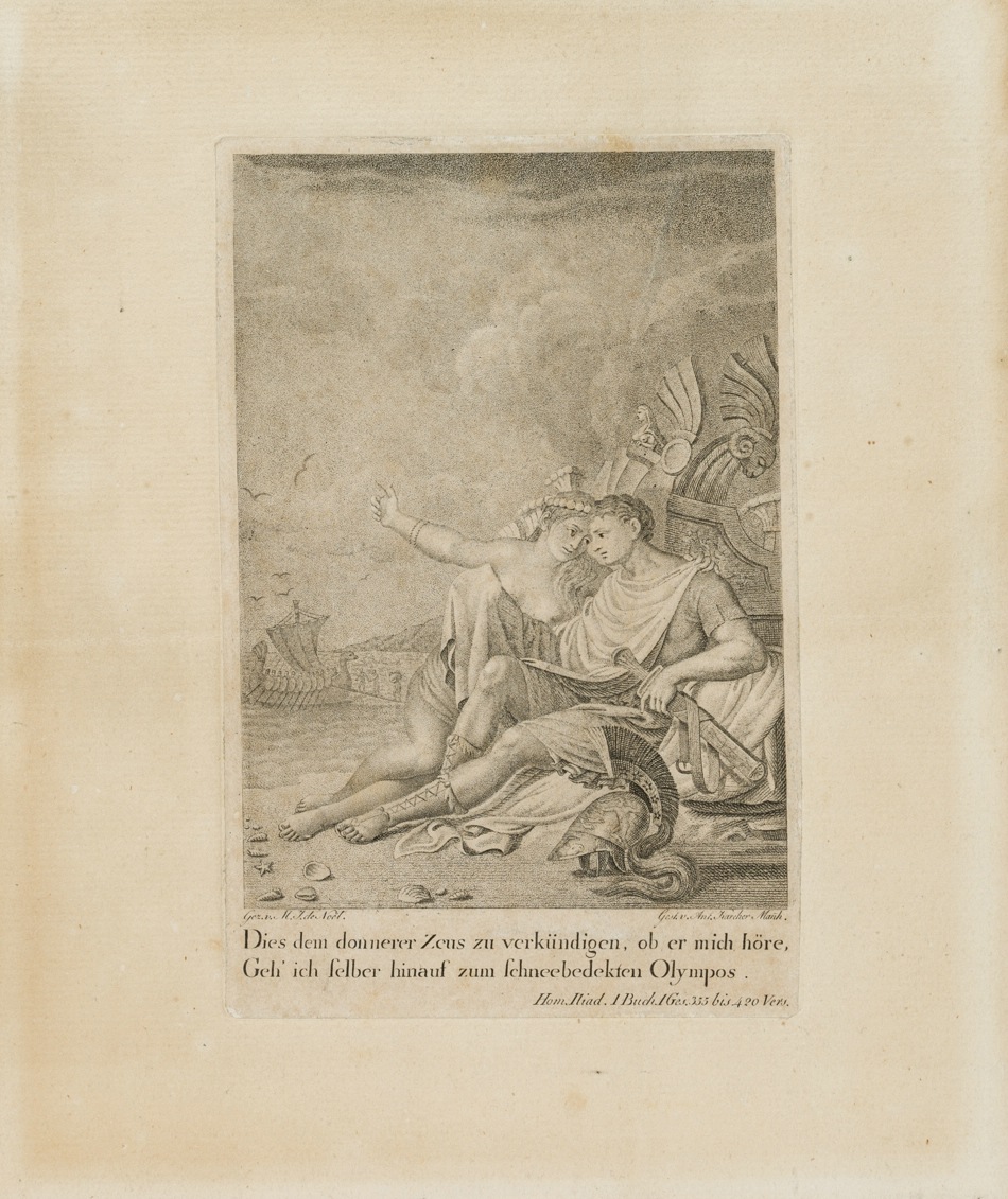 - Inscription: Signed lower left: “Gez. v. M. J. de Noël.”; signed lower right: “Gest. v. Ant. Karcher Manh.”; inscribed lower centre: “Dies dem thnerer Zeus zu verkünden, ob er mich höre,/ Geh’ ich selbst hinauf zum schneebedekten Olympos.”; inscribed lower right: “Hom. Iliad. 1 book. 1st Ges. 355 to 420 vers.”