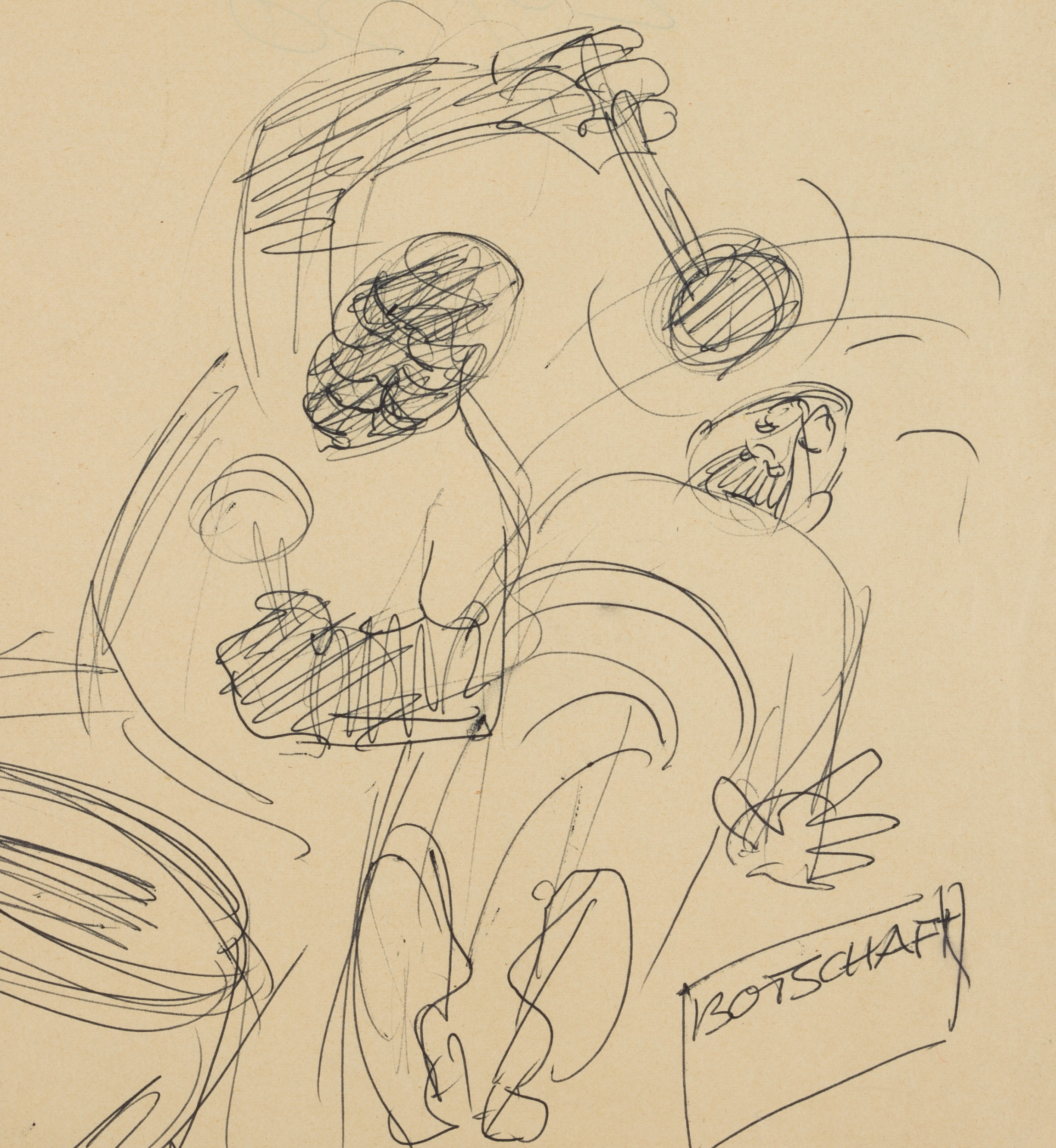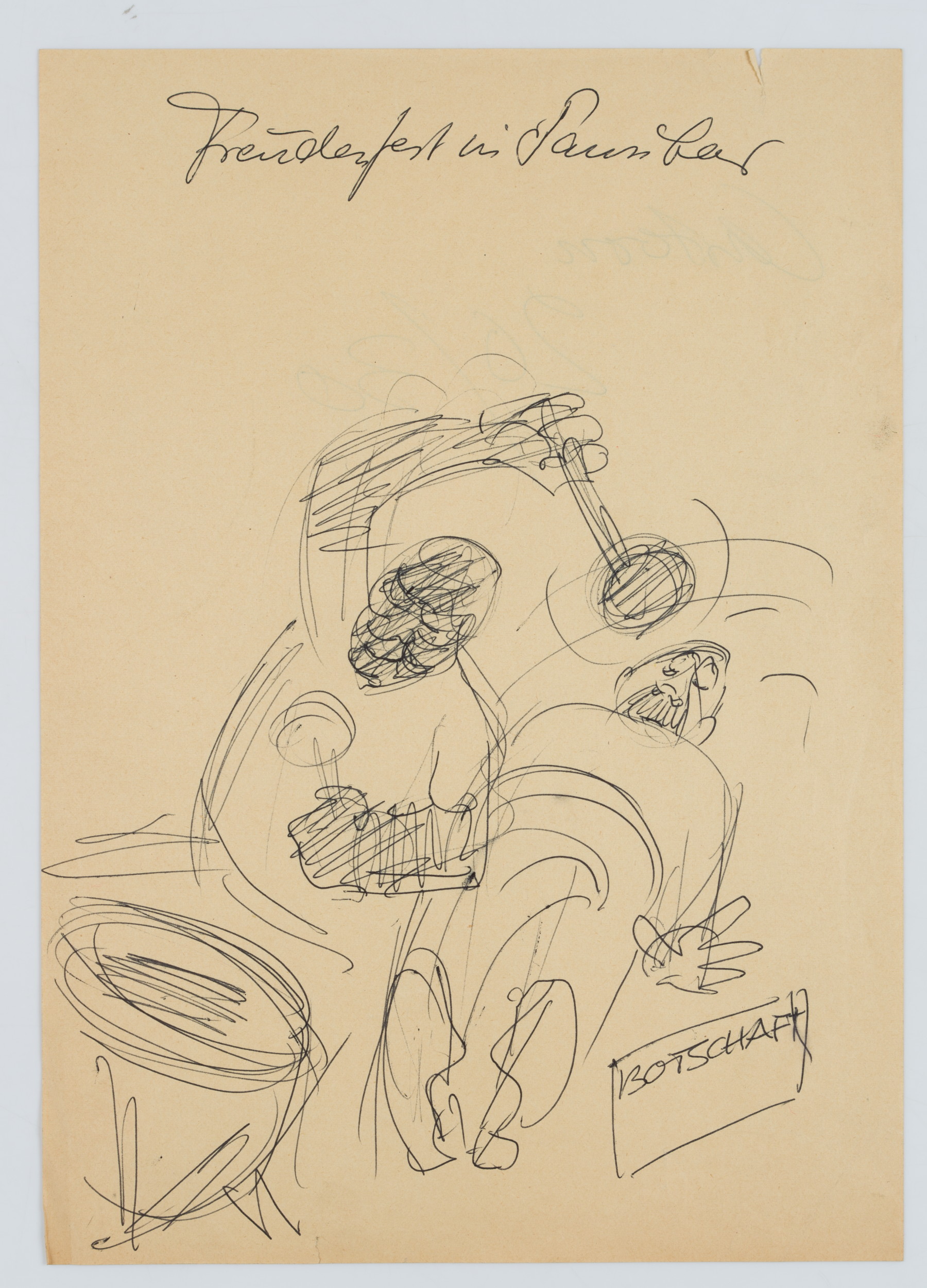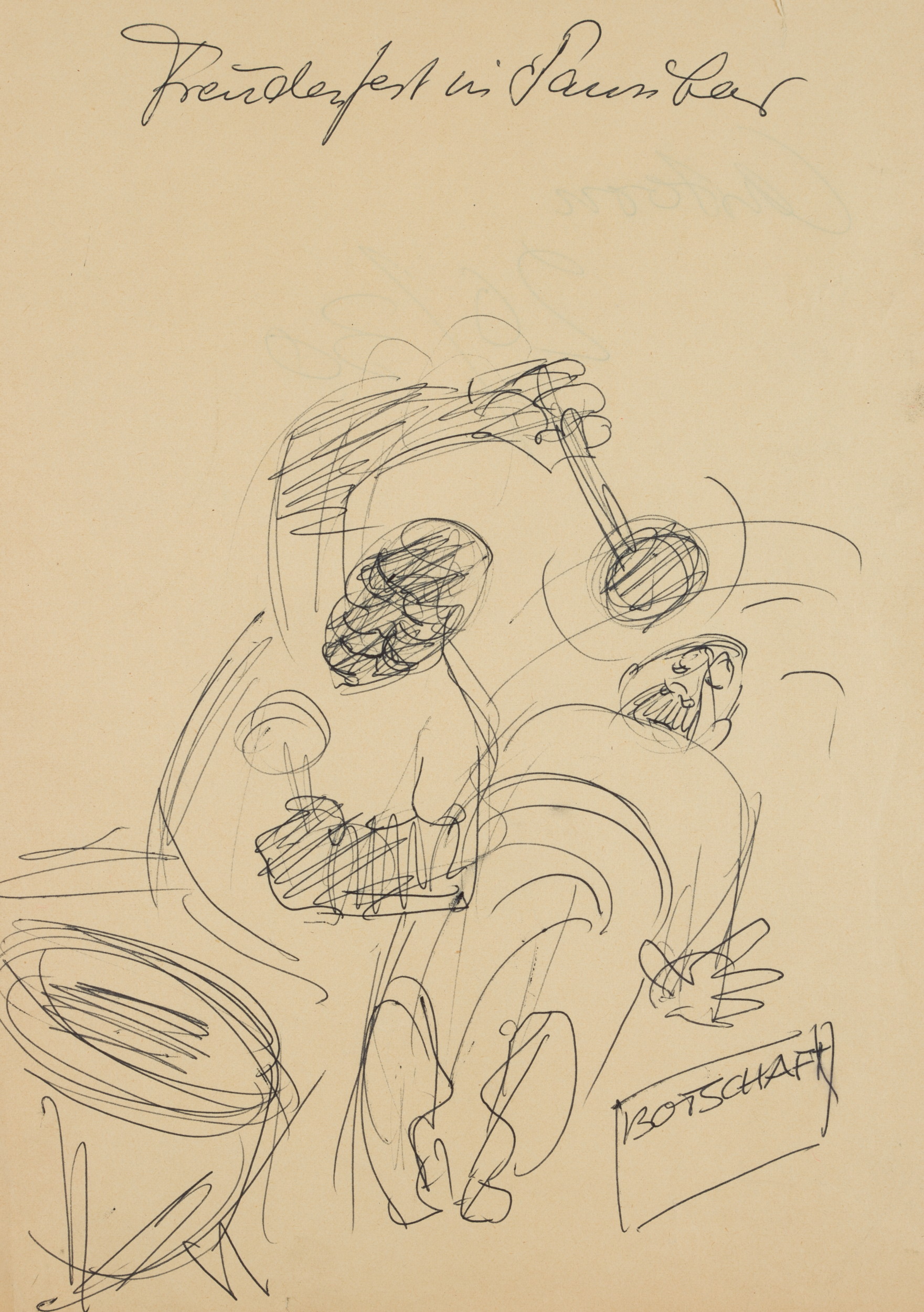 • Inscription: Inscribed by the artist’s hand: “Freudenfest in Sansibar / Botschaft”. Verso further inscription: “Cartoon 20/30”.