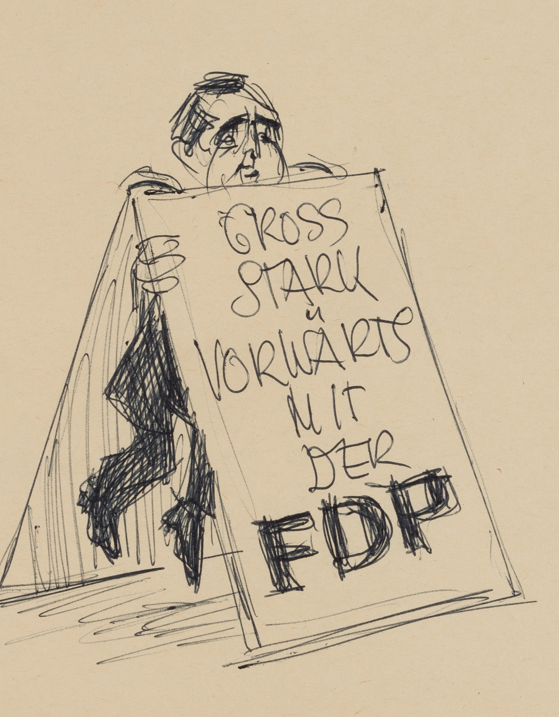 - Beschreibung: Politische Karikatur des Berliner Karikaturisten. Zeigt einen Mann mit zu großem Trageschild. Möglicherweise satirische Darstellung Erich Mendes, der 1962 als FDP-Bundesvorsitzender bestätigt wurde.