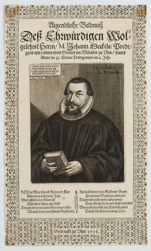 - Beschreibung: Oberhalb mit Angaben zum Dargestellten beschriftet: “Aigendliche Bildnuss Des Ehrwürdigen Wolgelehrtenherrn/ M. Johann Deckels/ Predigers am rainen wort Gottes im Münster zu Ulm / Seines Alters im 31. Seines Predigampts im 4. Jahr.”, unterhalb mit religiös erbaulichen Versen, darunter datiert.