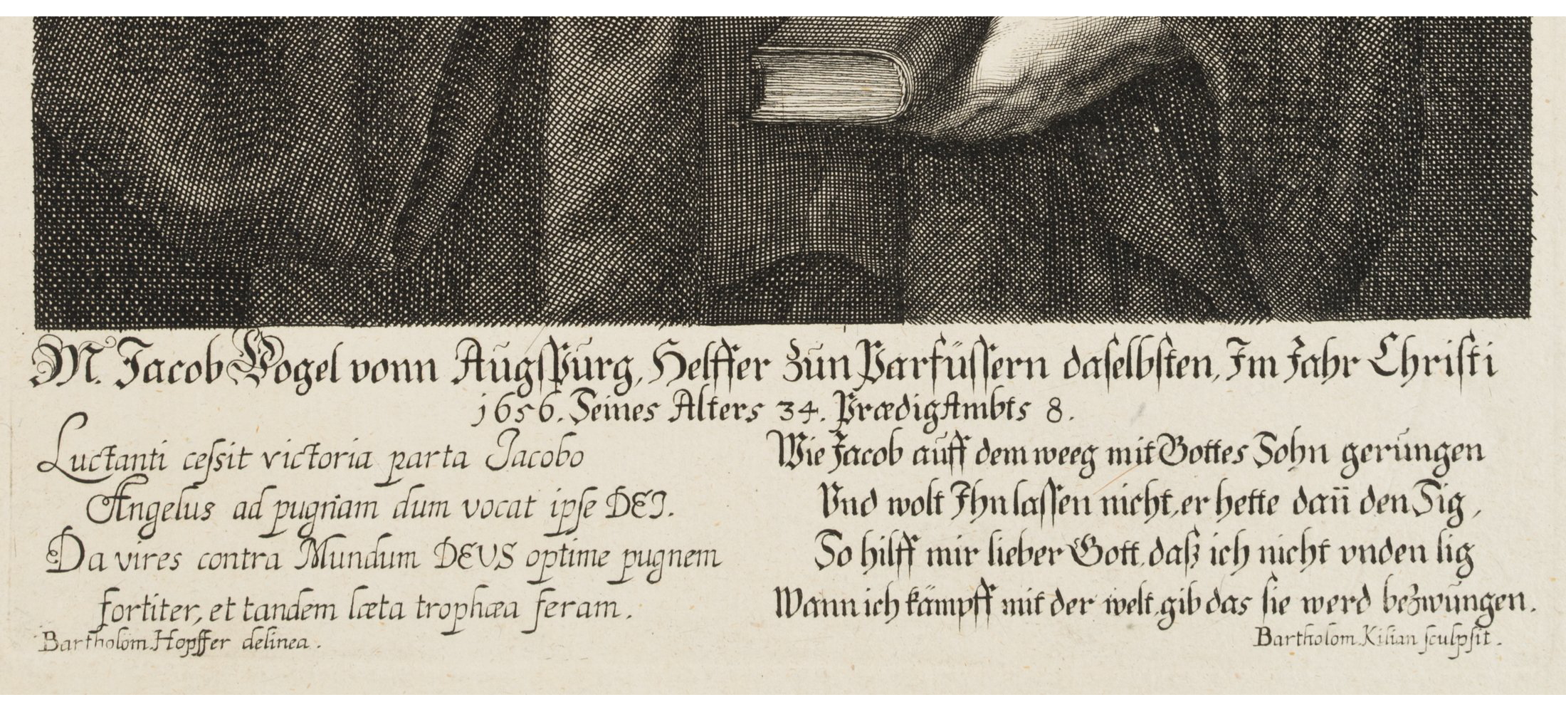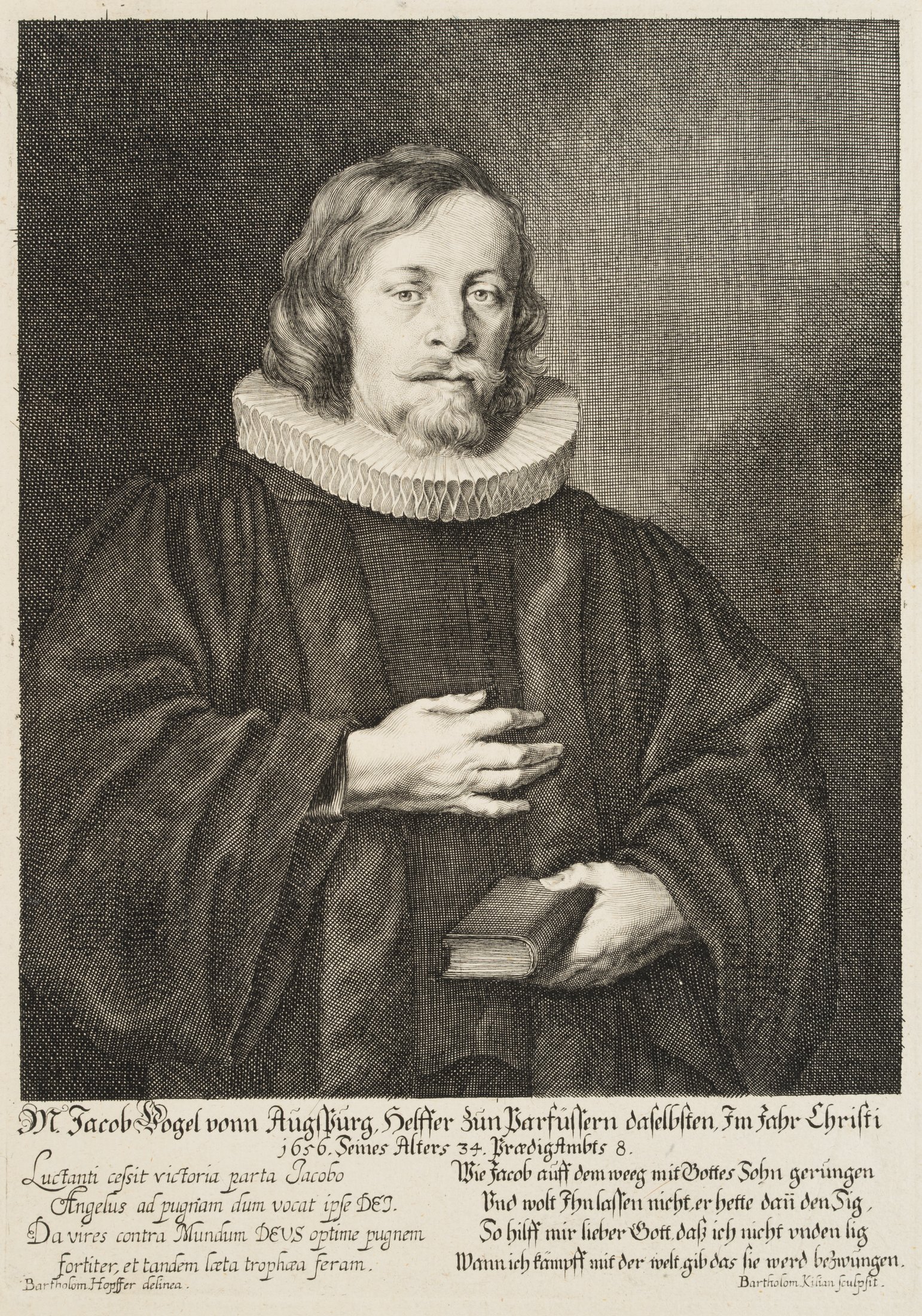 • Bezeichnung: Unterhalb der Darstellung bezeichnet “M. Jacob Vogel vonn Augsburg, Helffer zun Barfüssern daselbst, im Jahr Christi 1656. Seines Alters 34. Prædigtstmbts 8″, unten signiert ” Bartholom. Hopffer delinea.” und “Bartholom. Kilian sculpsit”, verso Sammlungsstempel “EK” Sammlung Erhard Oskar Kaps, Leipzig (Lugt Nr. 3549)