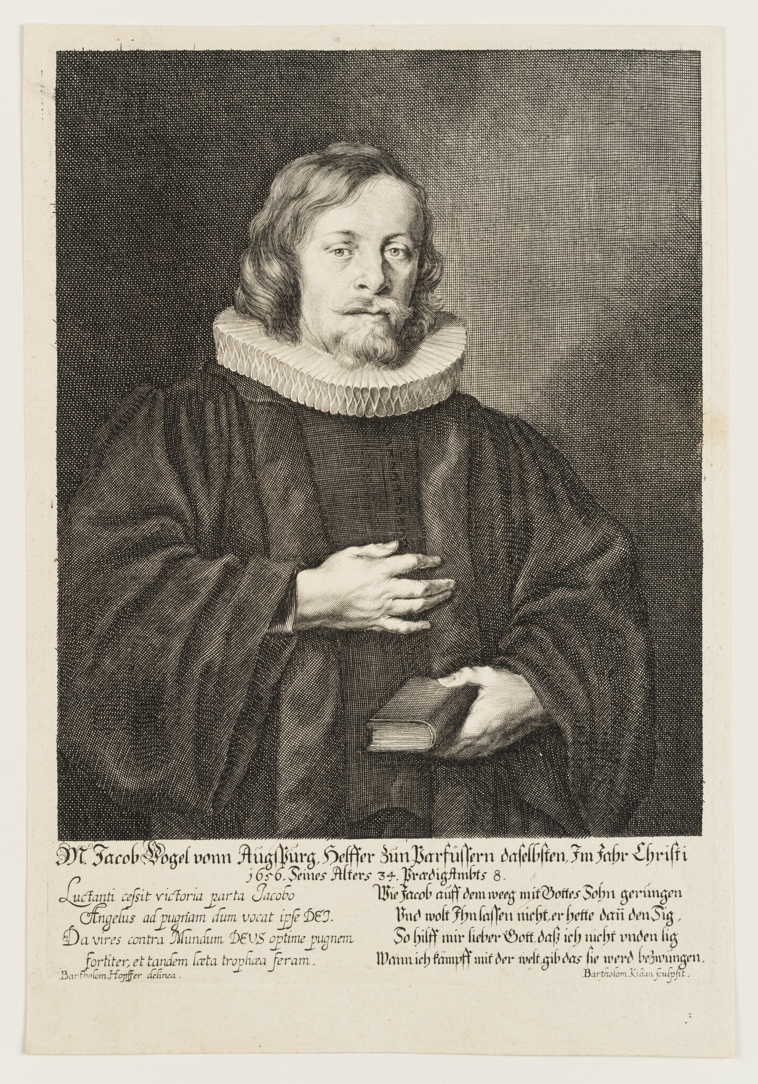 Bartholomäus Kilian (1630 Augsburg – 1696 ebd.) nach Bartholomäus Hopfer (17. Jahrhundert), Porträt des Augsburger Pfarrers Jacob Vogel von Augsburg, 1656, Kupferstich