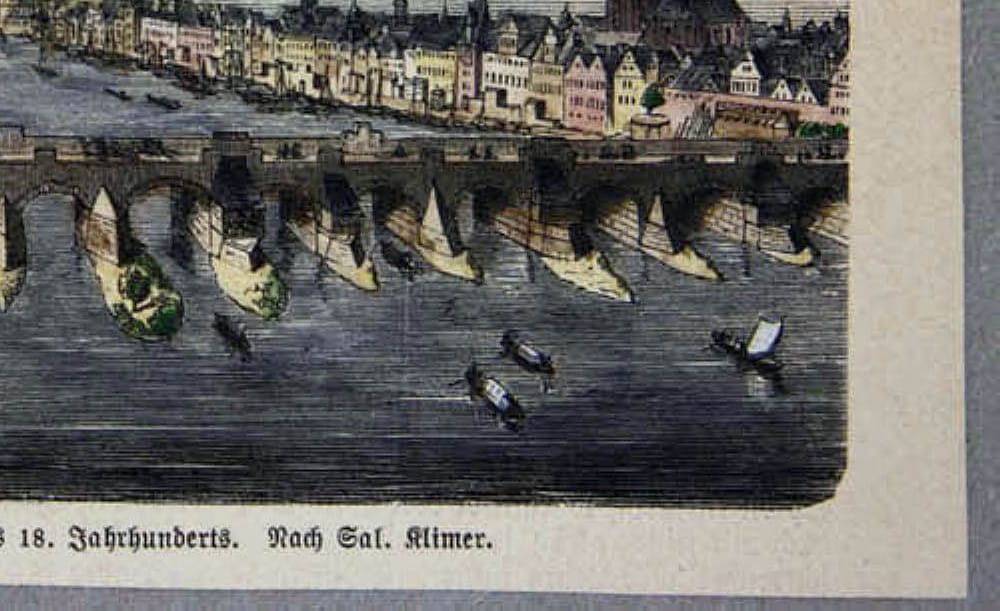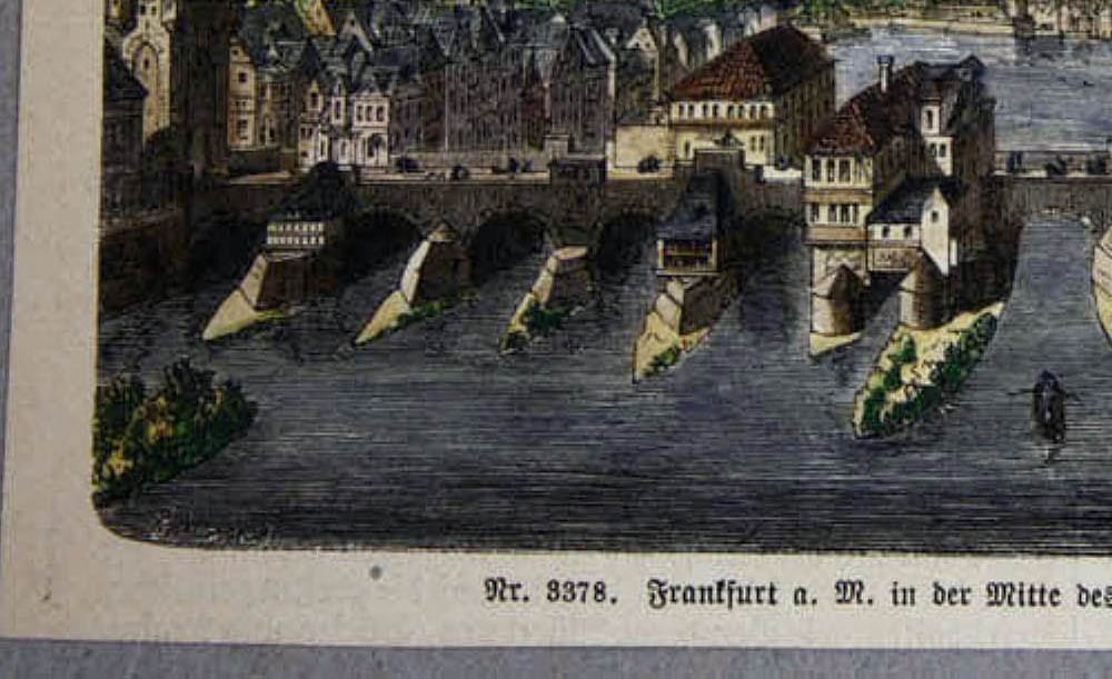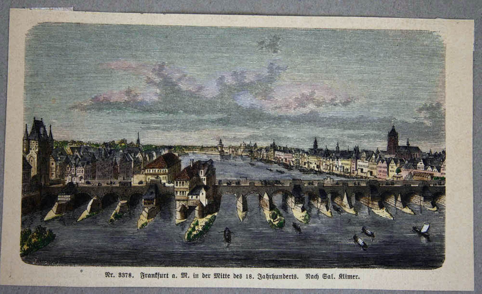 - Description: Ernst Kirchhoff, Frankfurt am Main, coloured wood engraving, c. 1850. Description: Coloured wood engraving by Ernst Kirchhoff, inscribed at the bottom: “No. 3378. Frankfurt a. M. in the middle of the 18th century. After Sal. Klimer”. Extract from an encyclopaedia? Very nice view of Frankfurt across the Alte Brücke. Fragment of explanations of names and terms on verso.