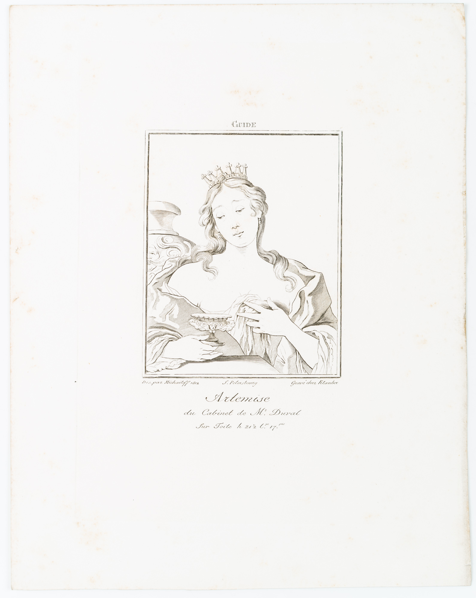 - Inscription: Signed and dated below the image in the printing plate “Des. par Michailoff 1812 / S. Petersbourg / Gravé chez Klauber”, below centrally titled ” Artemise / du cabinet de Mr. Duval”. Inscribed “Guide” above the image.